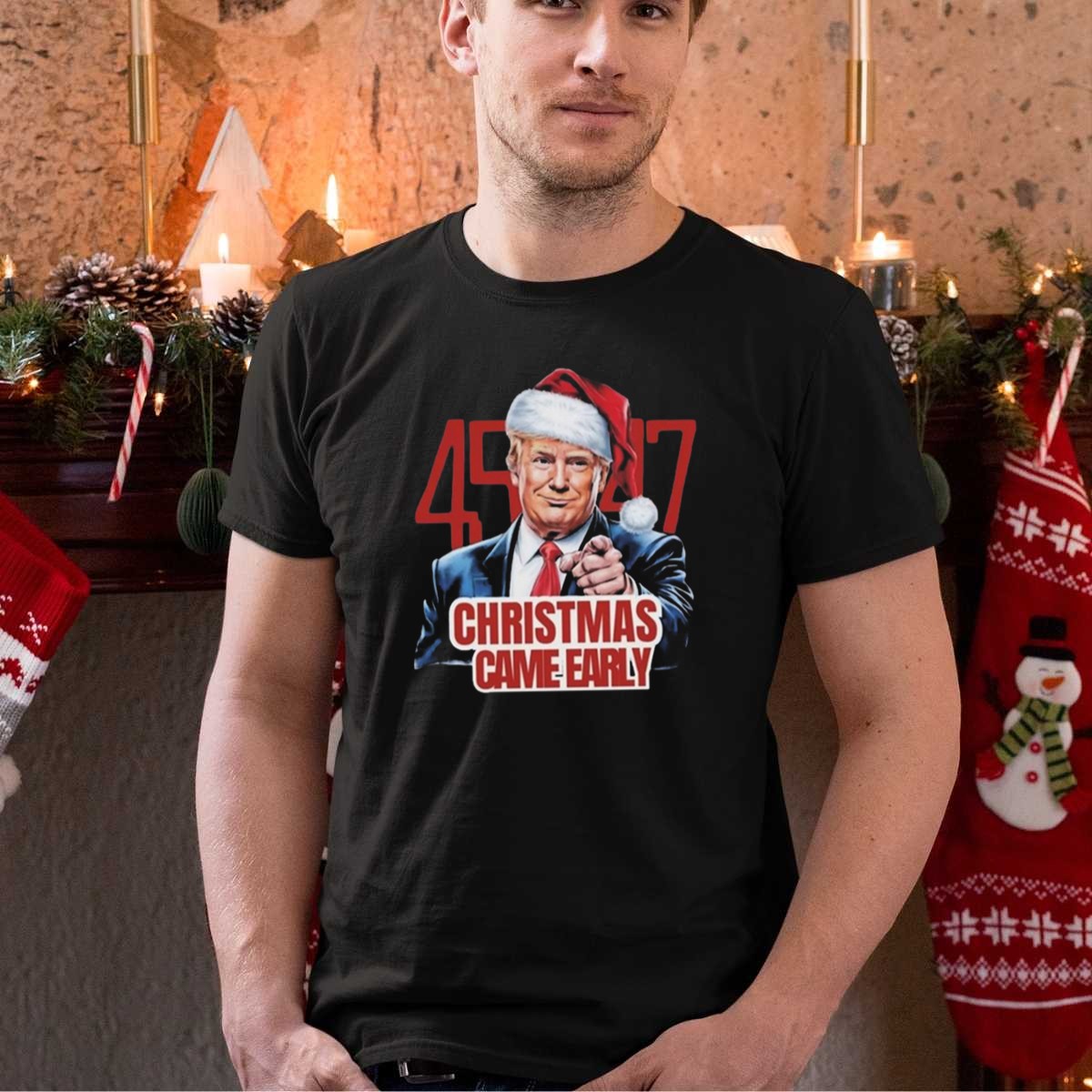 Celebrate the holiday season with our 45 47 Trump Christmas Came Early Santa Hat T-Shirt, perfect for fans who want to showcase their festive spirit while supporting their favorite political figure. This fun and eye-catching design is ideal for casual gatherings, themed events, or just spreading cheer during the holiday season. Made with care in the USA, this shirt combines a playful message with high-quality materials, making it a unique addition to your wardrobe.