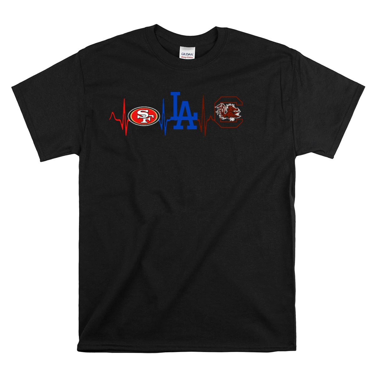 Show off your team spirit with our fan-made 49ers La Dodgers South Carolina Gamecocks Love T-Shirt! This stylish unisex tee is perfect for die-hard fans who want to celebrate their favorite teams in comfort and style. Whether you’re heading to a game, a themed event, or just enjoying a casual day out, this shirt is designed to make you stand out while keeping you comfortable. Proudly printed in the USA, it combines a love for sports with a fashionable edge.