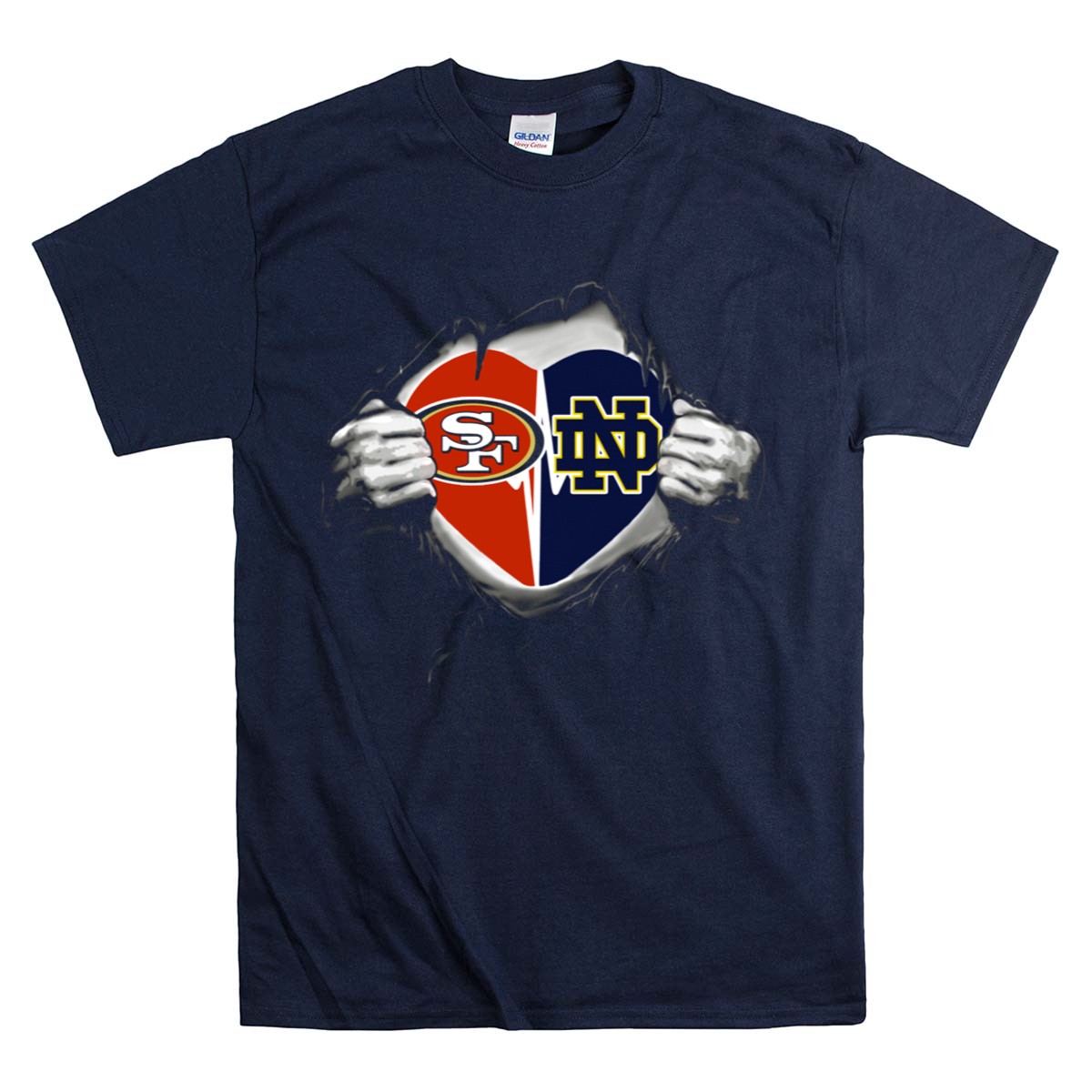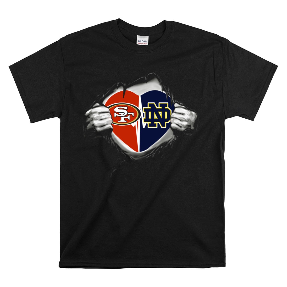 Show your team spirit with the 49ers Notre Dame Fighting Irish Heart Logos In My Heart T-Shirt! This fan-made design is perfect for die-hard supporters of both iconic teams, combining style and comfort for casual outings, themed events, or daily wear. Made with 100% cotton, this shirt is not only soft and breathable but also durable enough to withstand your enthusiastic cheering, making it a must-have for any true fan’s wardrobe.