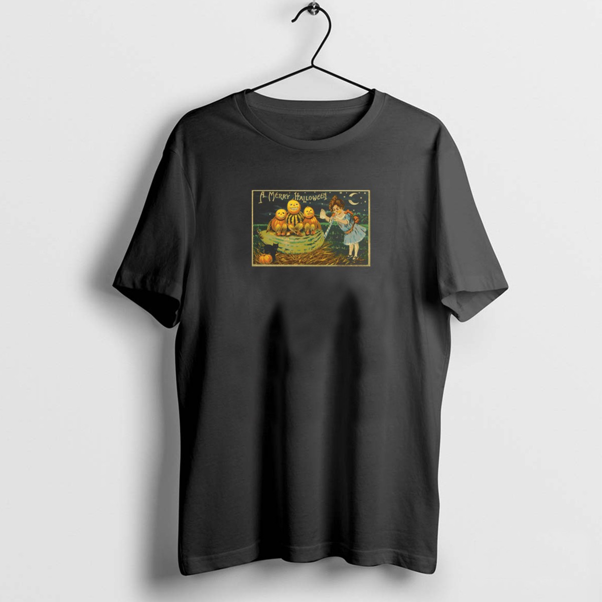 Celebrate the spooky season in style with our Merry Halloween Vintage Card T-Shirt, featuring charming Jack O’ Lanterns and a whimsical girl under the moon. This fan-made design is perfect for Halloween enthusiasts and adds a playful touch to your casual wardrobe. Ideal for themed events, trick-or-treating, or simply enjoying the autumn festivities, this shirt is a must-have for anyone looking to embrace the spirit of Halloween. With its soft and breathable fabric, you’ll stay comfortable while showcasing your love for this enchanting holiday.