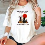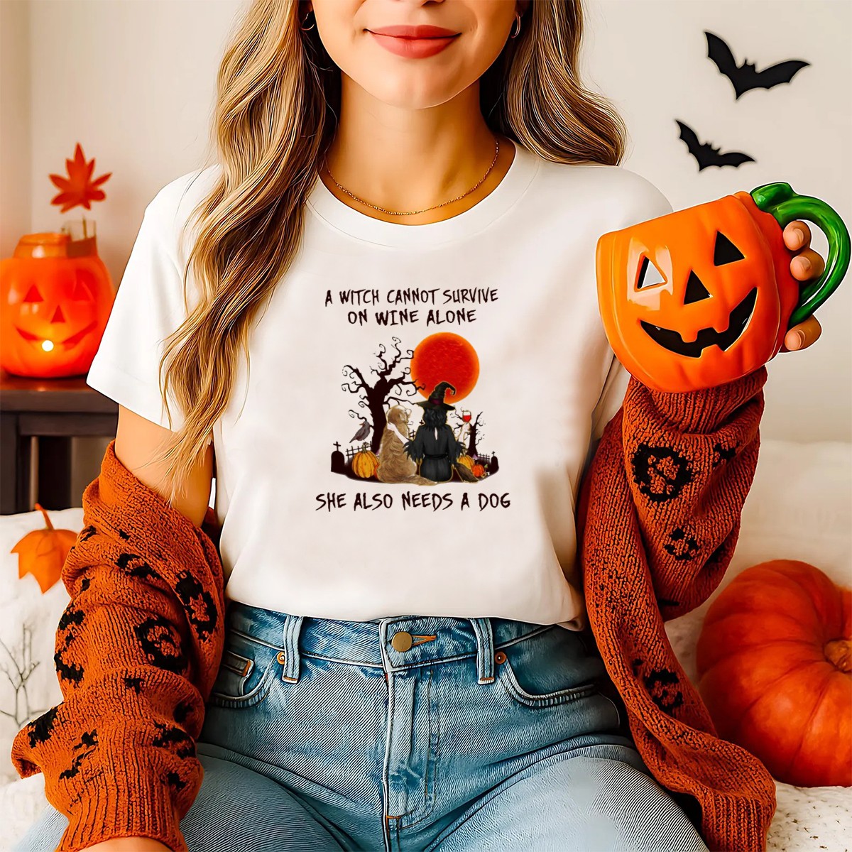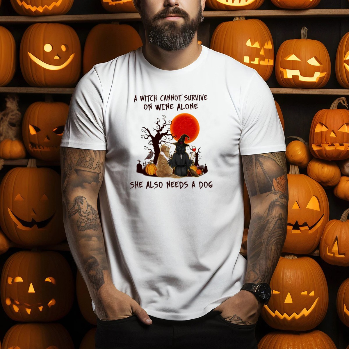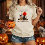 A Witch Cannot Survive On Wine Alone She Also Needs A Dog Halloween Scene With Witch T-Shirt