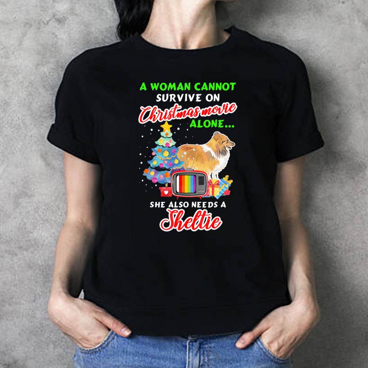 Celebrate your love for Christmas movies and your furry friend with our “A Woman Cannot Survive On Christmas Movies Alone She Also Needs A Sheltie” T-shirt! Perfect for dog lovers and holiday enthusiasts alike, this fan-made design captures the joy of the season while showcasing your passion for Shelties. Ideal for cozy nights in, themed events, or casual outings, this shirt is a festive addition to your wardrobe that spreads cheer wherever you go.