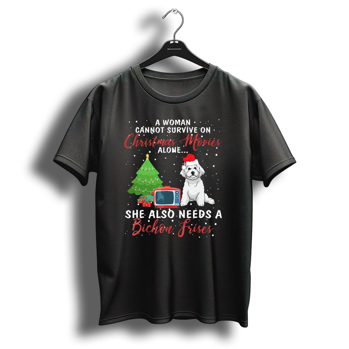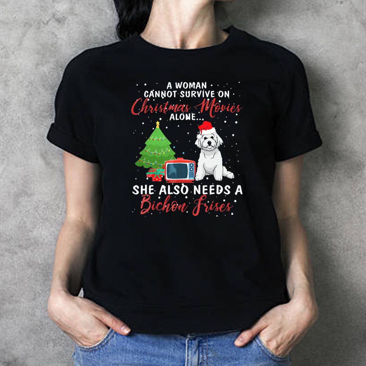 A Woman Cannot Survive On Christmas Movies Alone She Also Needs A Bichon Frise T-Shirt