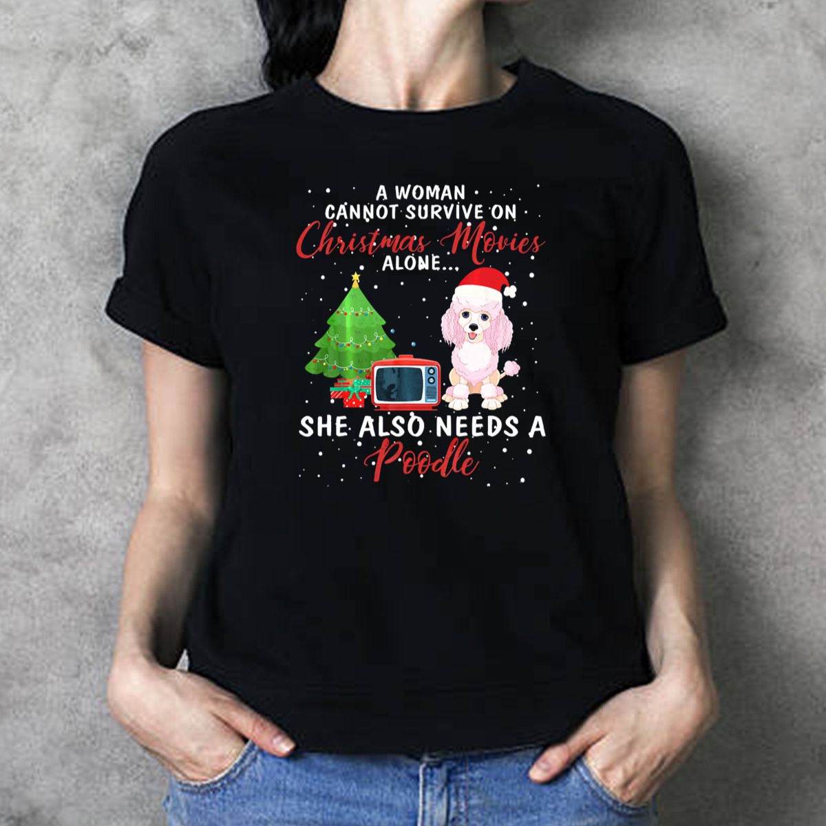 Celebrate your love for Christmas movies and your favorite furry friend with our “A Woman Cannot Survive On Christmas Movies Alone She Also Needs A Poodle” T-shirt! This fun and quirky design is perfect for dog lovers and holiday enthusiasts alike. Whether you’re cozying up for a movie marathon or attending a themed event, this shirt adds a playful touch to your casual wardrobe. Made with care right here in the USA, it’s a must-have for anyone who enjoys spreading holiday cheer with a dash of humor.