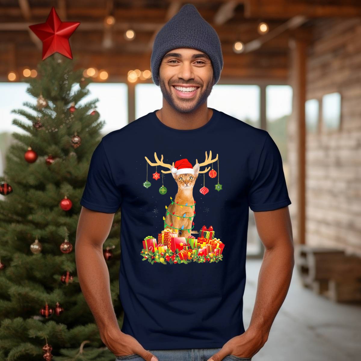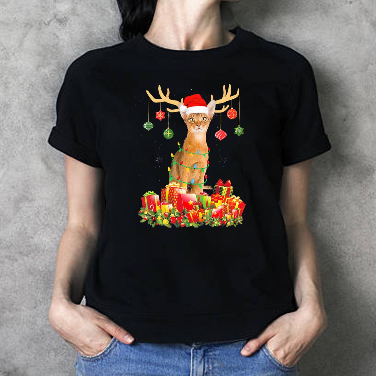 Abyssinian Cat With Santa Hat And Reindeer Antlers Surrounded By Christmas Gifts T Shirt