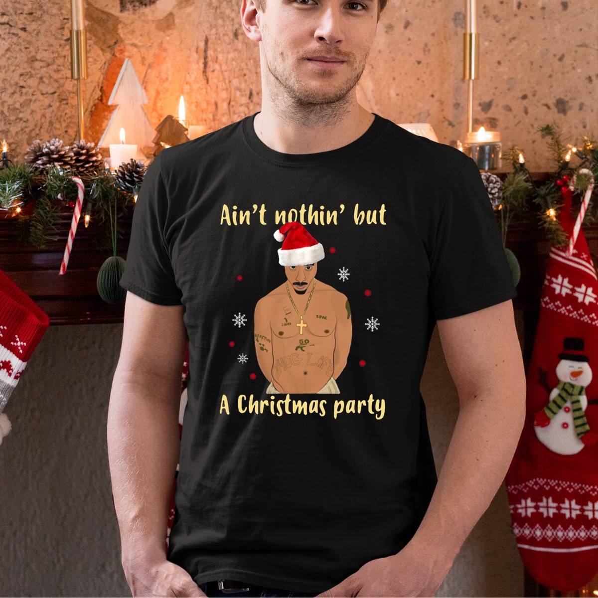 Celebrate the holiday spirit with a twist of hip-hop flair in our Ain’t Nothin’ But A Christmas Party Santa Hat Tattooed Tupac T-Shirt! Perfect for fans of Tupac and those who love to stand out at festive gatherings, this unique shirt combines the joy of Christmas with the iconic style of one of rap’s legends. Whether you’re heading to a casual get-together, themed event, or just want to express your love for music during the holiday season, this shirt is a must-have addition to your wardrobe.