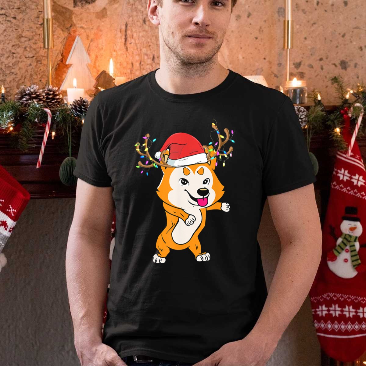 Akita Inu With Santa Hat And Reindeer Antlers With Christmas Lights T Shirt