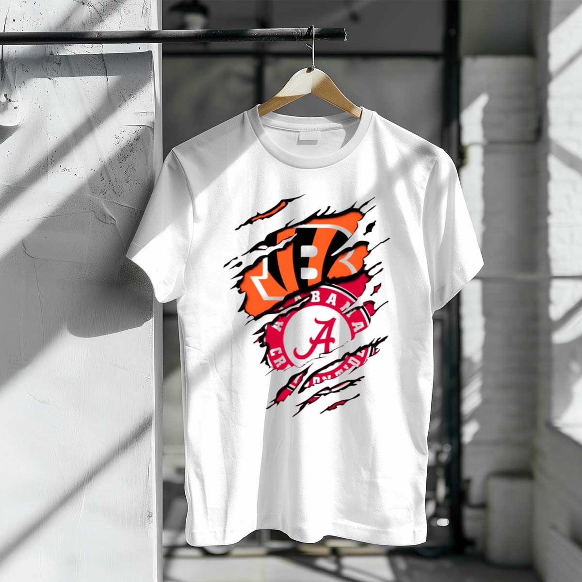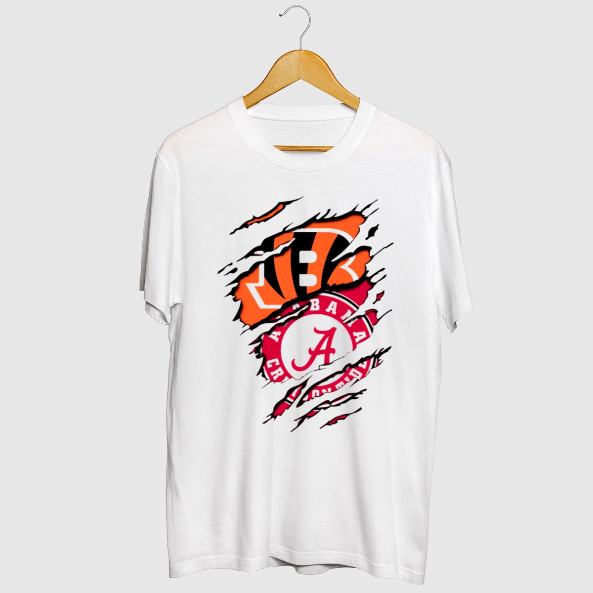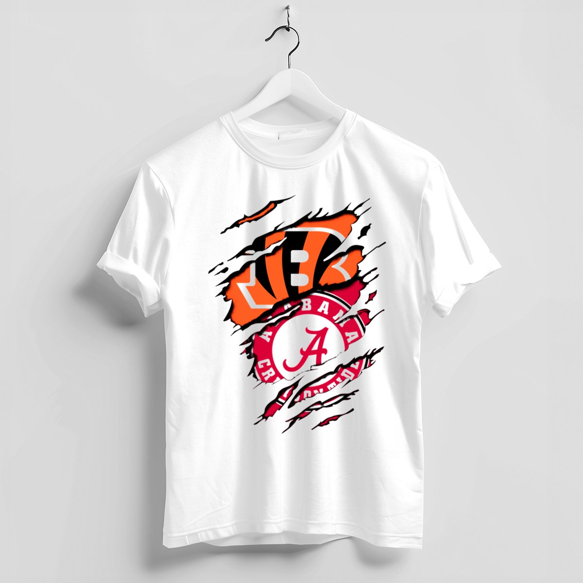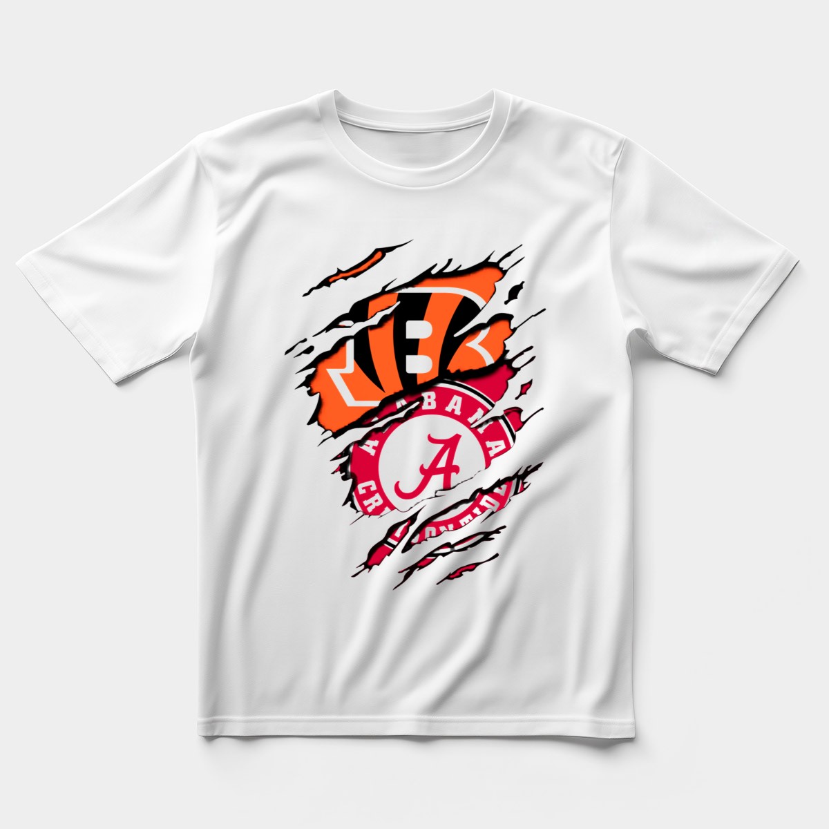 Show your team spirit with the Alabama Crimson Tide Cincinnati Bengals Rip Claw T-Shirt! This fan-made design is perfect for die-hard supporters of both teams, making it an ideal choice for casual outings, themed events, or just daily wear. Crafted for comfort and durability, this classic-fit T-shirt is sure to become a favorite in your wardrobe, celebrating your love for football in style.
