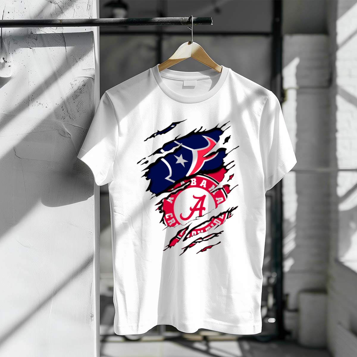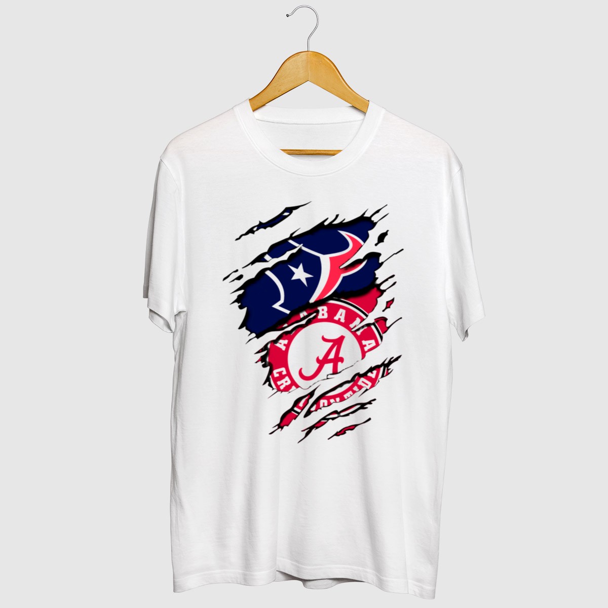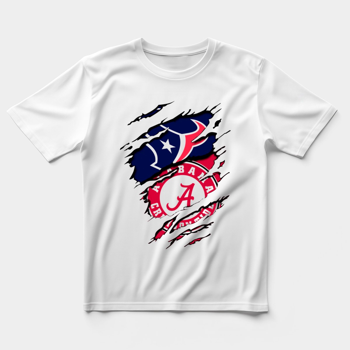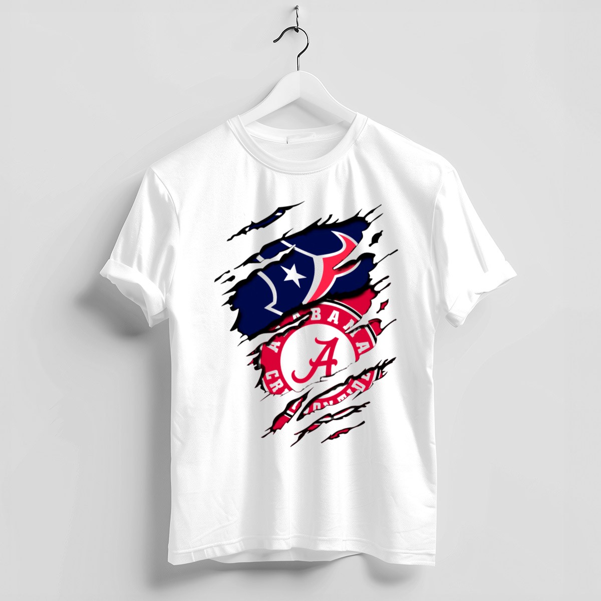 Show your team spirit with the Alabama Crimson Tide Texans Football Torn T-Shirt, a must-have for any die-hard fan! This fan-made design, proudly printed in the USA, is perfect for casual outings, themed events, or just lounging around while cheering for your favorite team. Made from 100% cotton, this shirt combines comfort and style, ensuring you look great while supporting the Crimson Tide. Whether it’s game day or any day, this classic fit tee is the perfect addition to your wardrobe.