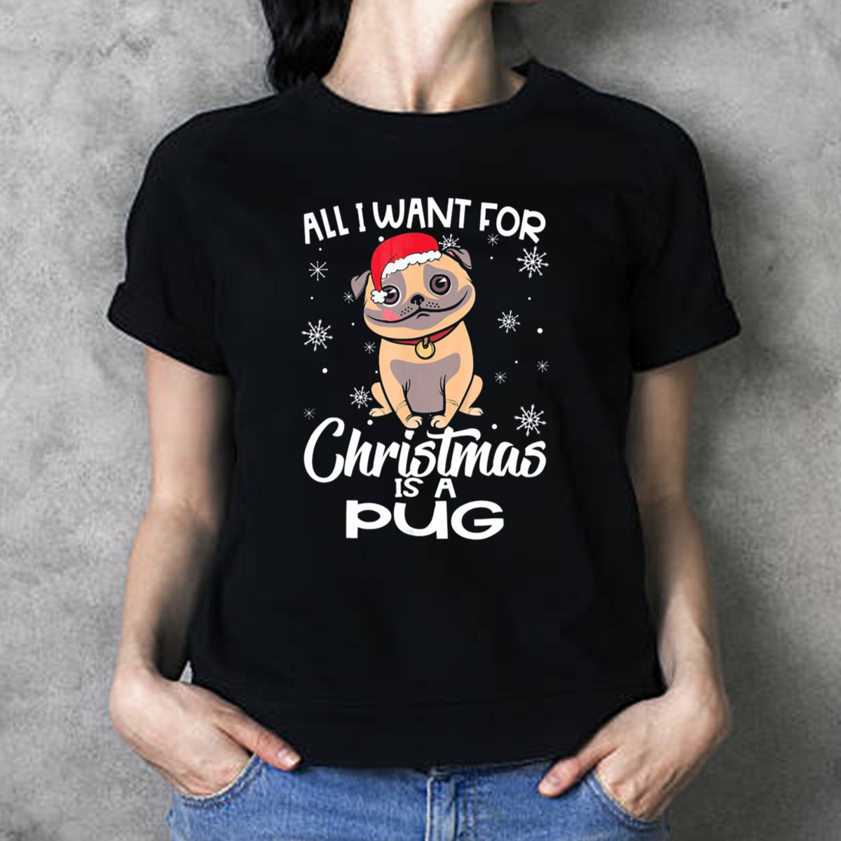 Be the first to review “All I Want For Christmas Is A Pug Wearing Santa Hat Snowflakes T-Shirt”