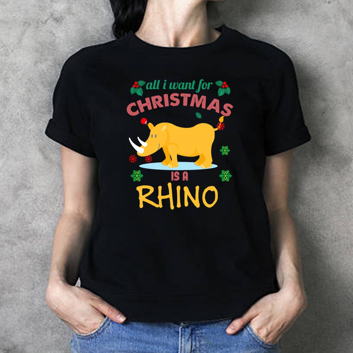 Celebrate the holiday spirit with our “All I Want For Christmas Is A Rhino With Festive Holly And Snowflakes” T-shirt! Perfect for animal lovers and holiday enthusiasts alike, this fun and quirky graphic tee brings a unique twist to your festive wardrobe. Ideal for casual outings, themed parties, or cozy days at home, this shirt is sure to spark joy and laughter wherever you go. Made with love and printed in the USA, it’s a must-have for anyone looking to add a touch of whimsy to their seasonal attire.