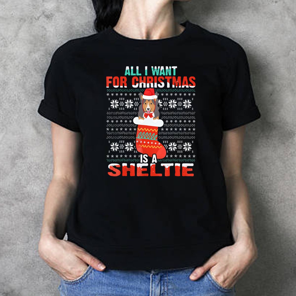 All I Want For Christmas Is A Sheltie In Festive Stocking With Ugly T Shirt