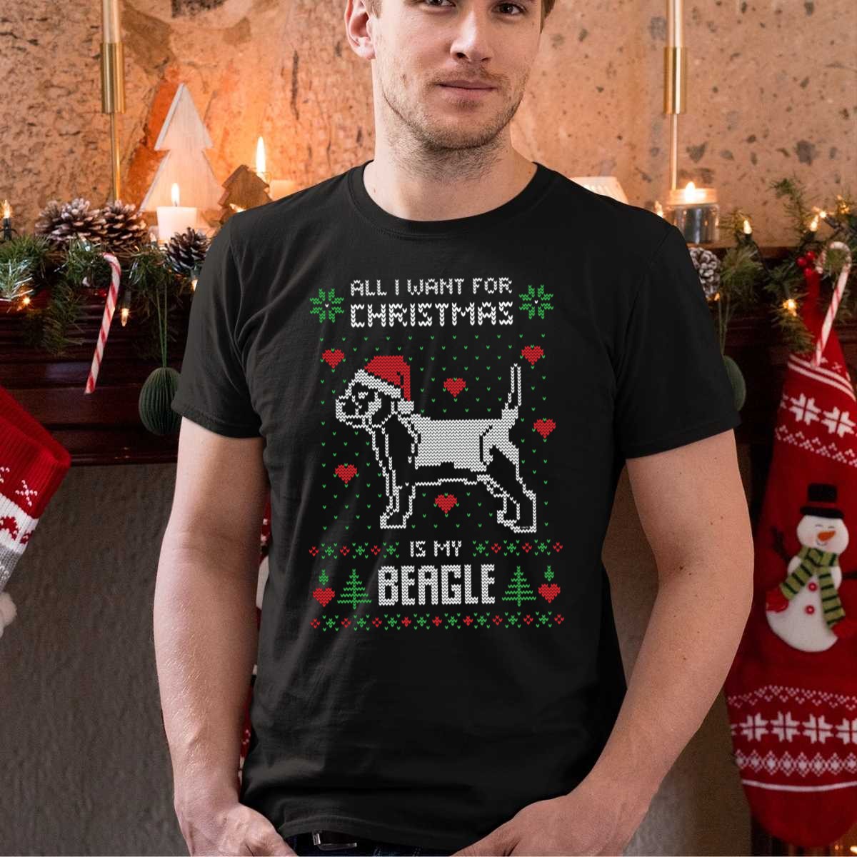 Be the first to review “All I Want For Christmas Is My Beagle Dog In Santa Hat With Red Hearts And Green Trees T-Shirt”