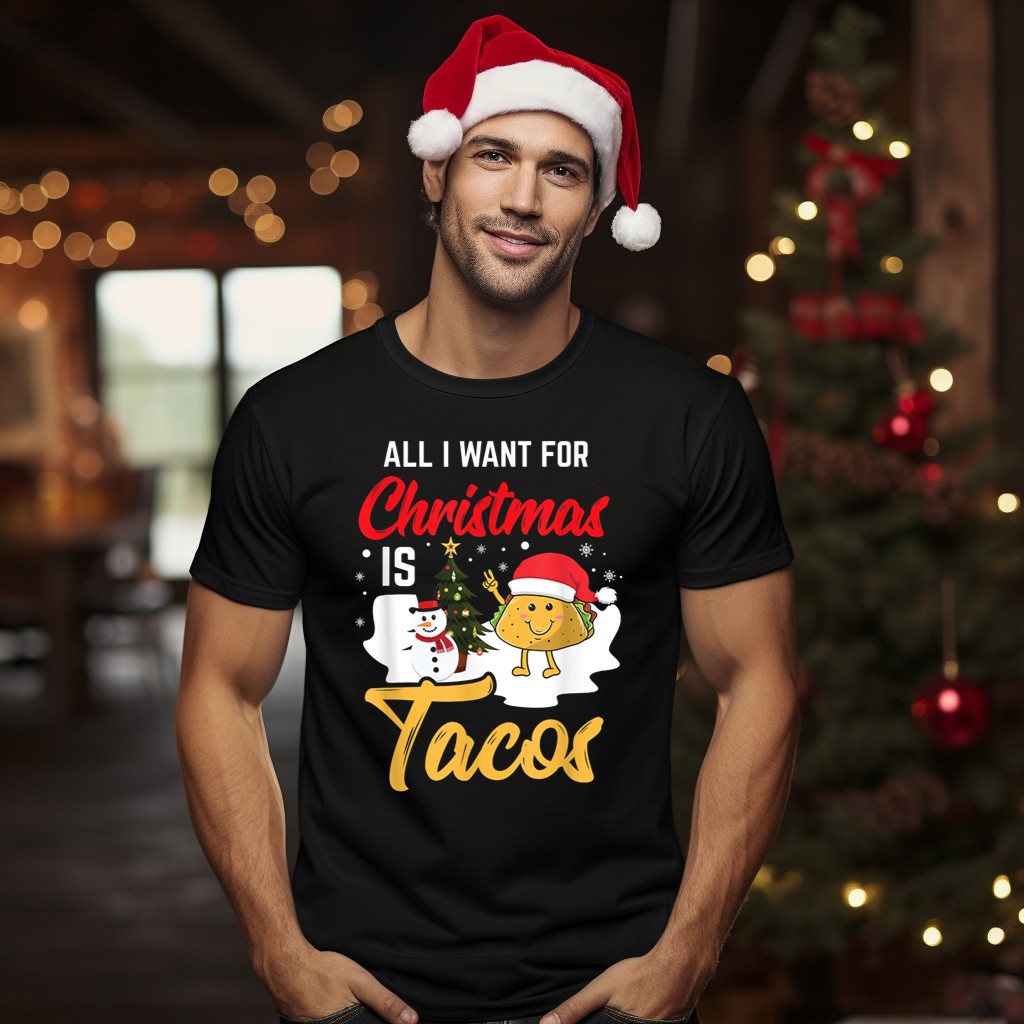 Celebrate the holiday season with a twist of humor in our “All I Want For Christmas Is Tacos” Snowman Santa Hat T-Shirt! Perfect for taco lovers and those who appreciate a good laugh, this playful design is ideal for casual gatherings, themed parties, or just lounging at home. Made for comfort and style, this shirt will keep you feeling festive while showcasing your unique personality. Spread the joy of tacos this Christmas!