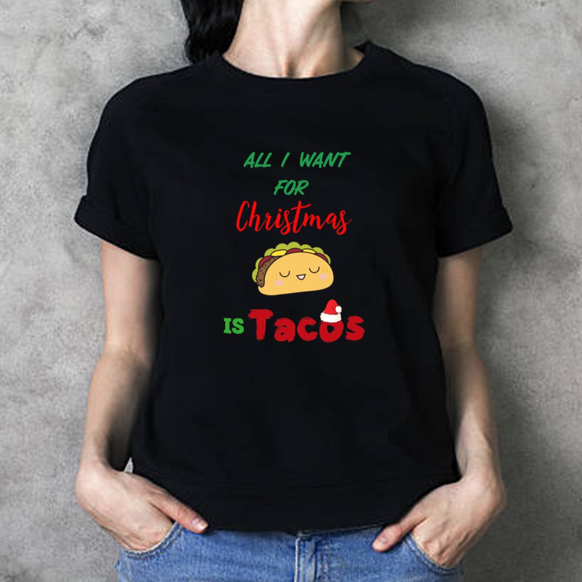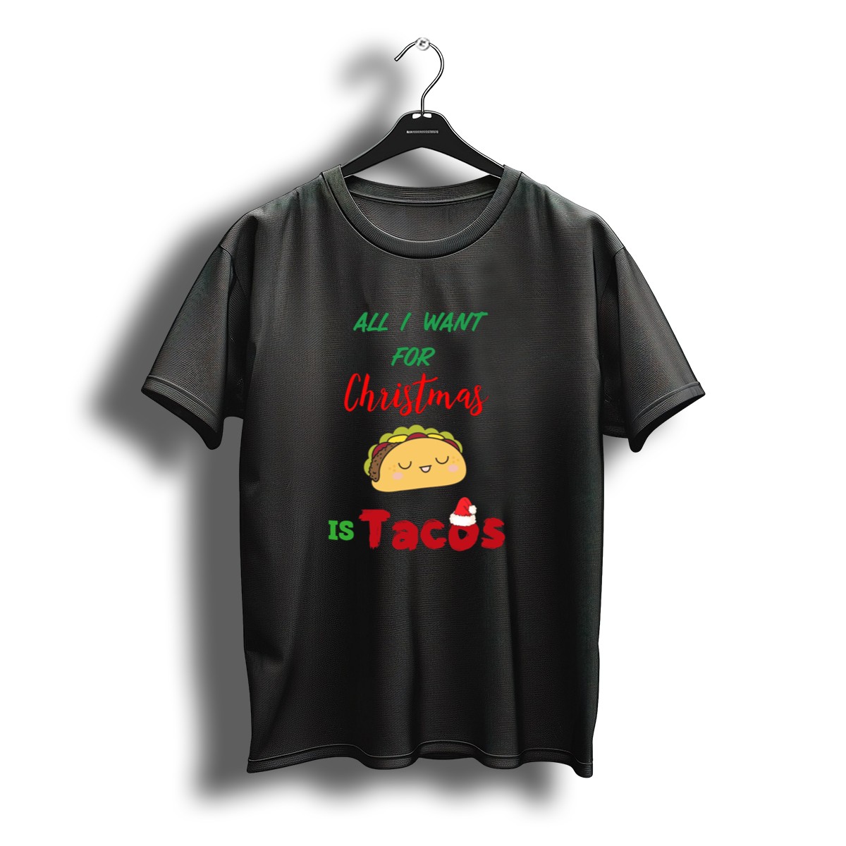 Celebrate the festive season with a fun twist in our “All I Want For Christmas Is Tacos” T-shirt featuring a playful Santa hat design. Perfect for taco lovers and holiday enthusiasts alike, this shirt adds a dash of humor to your casual wardrobe. Ideal for themed events, holiday gatherings, or just lounging around during the festive season, it’s a unique way to express your love for tacos while spreading Christmas cheer!