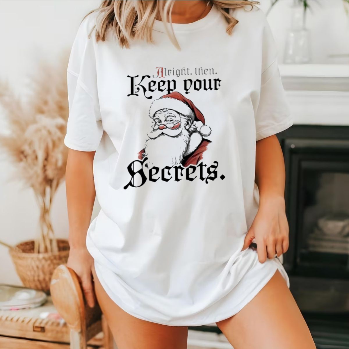 Get ready to bring some laughter to your holiday festivities with our “Alright Then Keep Your Secrets” Funny Santa Christmas T-Shirt! This fan-made design is perfect for anyone looking to add a touch of humor to their Christmas wardrobe. Whether you’re attending a themed event, a casual gathering with friends, or just enjoying daily wear during the festive season, this shirt is sure to be a hit. Made with soft and durable cotton, it’s the ideal choice for spreading holiday cheer while staying comfortable!