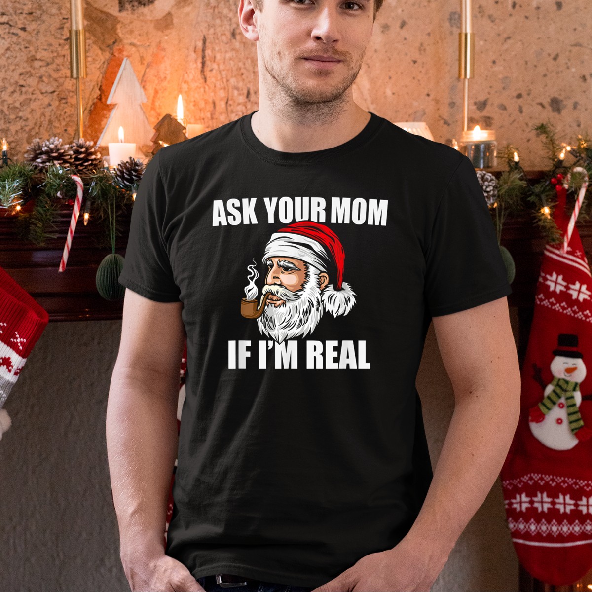 Celebrate the holiday season with a touch of humor in our “Ask Your Mom If I’m Real Funny Santa Claus” T-shirt. Perfect for those who love to spread joy and laughter at Christmas gatherings, this fan-made design is ideal for casual wear, themed events, or simply lounging around during the festive season. Crafted for comfort and style, this shirt is sure to become a favorite in your wardrobe.