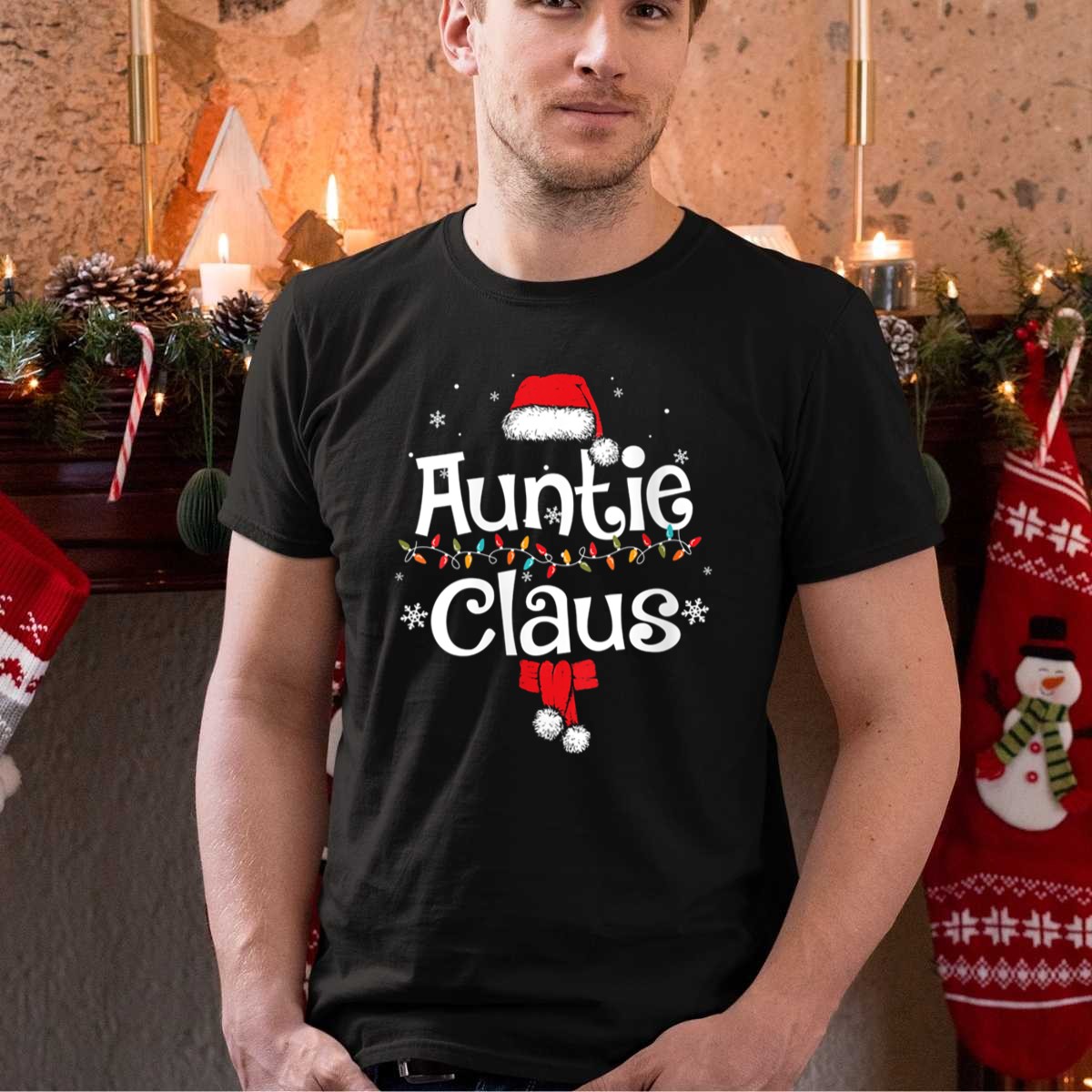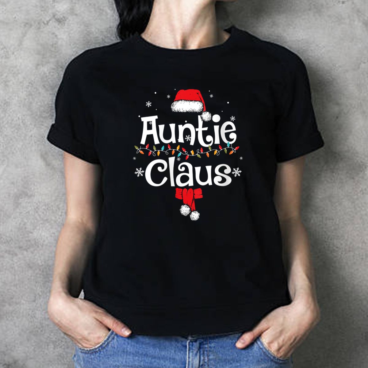 Be the first to review “Auntie Claus Christmas Lights Santa Hat Snowflakes T Shirt”