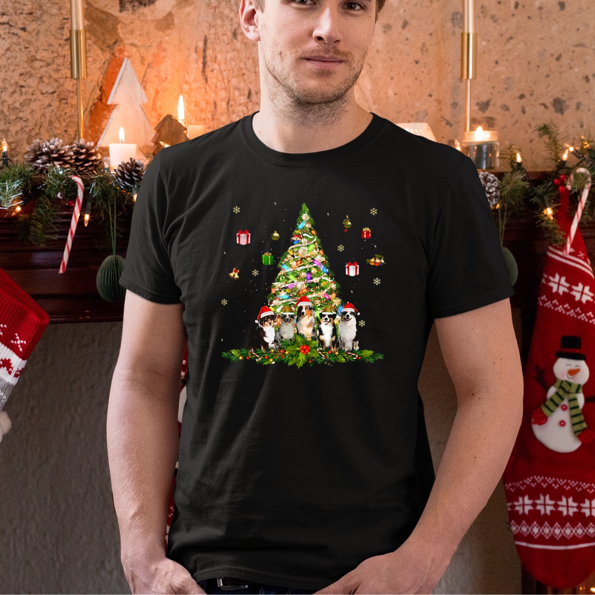 Australian Shepherds With Santa Hats And Colorful Christmas Tree With Gifts And T-Shirt