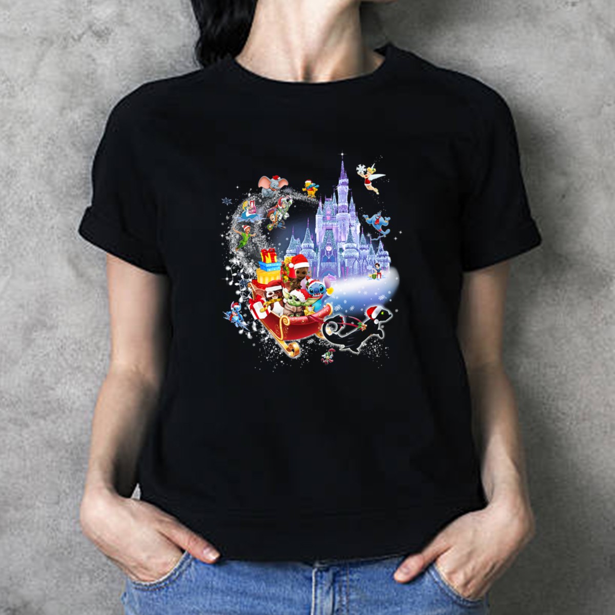 Celebrate the magic of the holiday season with our Baby Yoda Christmas T-shirt! This fan-made design brings together your favorite characters like Baby Yoda, Tinker Bell, and Dumbo, all nestled in a whimsical winter wonderland. Perfect for Disney enthusiasts and families alike, this shirt is ideal for themed events, casual gatherings, or daily wear during the festive season. Made in the USA, it’s not just a shirt; it’s a celebration of joy and nostalgia!