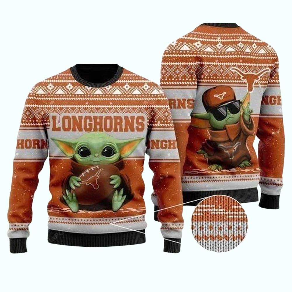 Get ready to cheer on your favorite team with our Baby Yoda Texas Longhorns Football Ugly Sweater! Perfect for fans of all ages, this whimsical sweater combines the beloved character with the spirited vibe of Texas football. Whether you’re tailgating at the game or enjoying a cozy night in, this sweater is your ticket to festive fun and comfort!