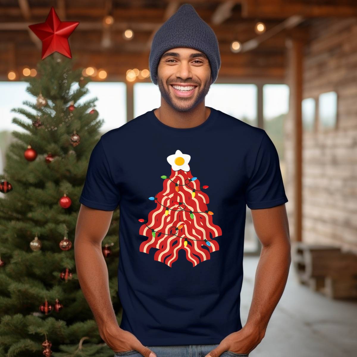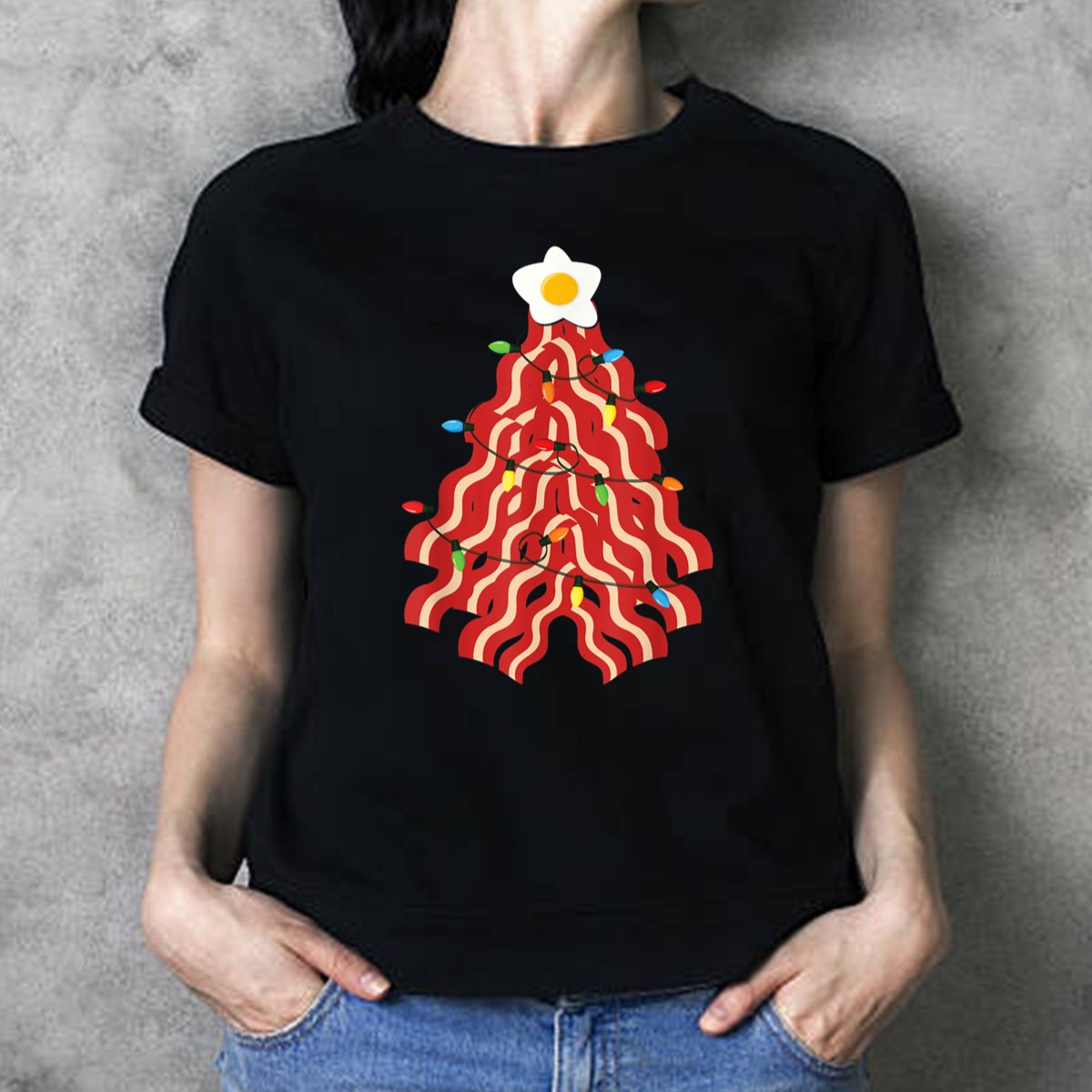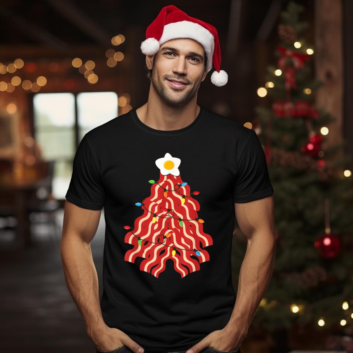 Celebrate the holiday season with a delicious twist on tradition! This Bacon Christmas Tree T-shirt is perfect for pork lovers who want to showcase their love for all things savory during festive gatherings or casual outings. Its fan-made design features a whimsical bacon tree topped with a star made of egg and adorned with lights, making it a unique addition to your wardrobe. Ideal for themed events, daily wear, or simply spreading holiday cheer, this shirt is sure to turn heads and spark conversations.