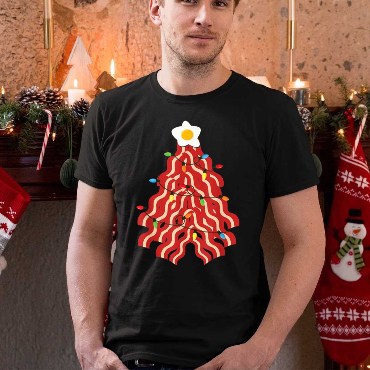 Be the first to review “Bacon Christmas Tree With Egg Star And Lights For Pork Lovers T-Shirt”