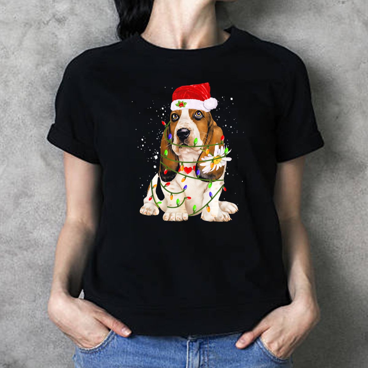 Celebrate the festive spirit with our Basset Hound Christmas Lights Santa Hat And Daisy T-Shirt! Perfect for dog lovers and holiday enthusiasts alike, this charming design features an adorable Basset Hound decked out in festive lights and a jolly Santa hat. It’s an ideal choice for casual wear, themed events, or simply spreading cheer during your daily activities. Made for comfort and style, this fan-made design is proudly printed in the USA, making it a unique addition to your holiday wardrobe.