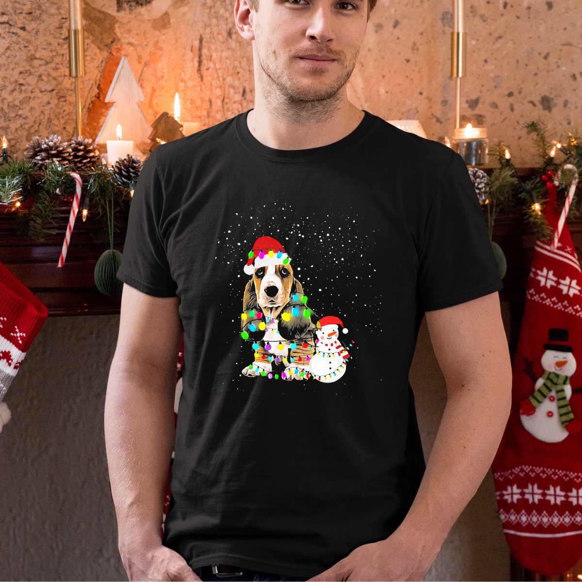 Celebrate the holiday season with our delightful Basset Hound Christmas Lights Snowman Santa Hat T-Shirt! Perfect for dog lovers and festive spirits alike, this shirt is ideal for casual gatherings, themed events, or simply spreading cheer throughout your daily activities. With its fan-made design proudly printed in the USA, it showcases a charming blend of holiday fun and canine cuteness that makes it a unique addition to your wardrobe.