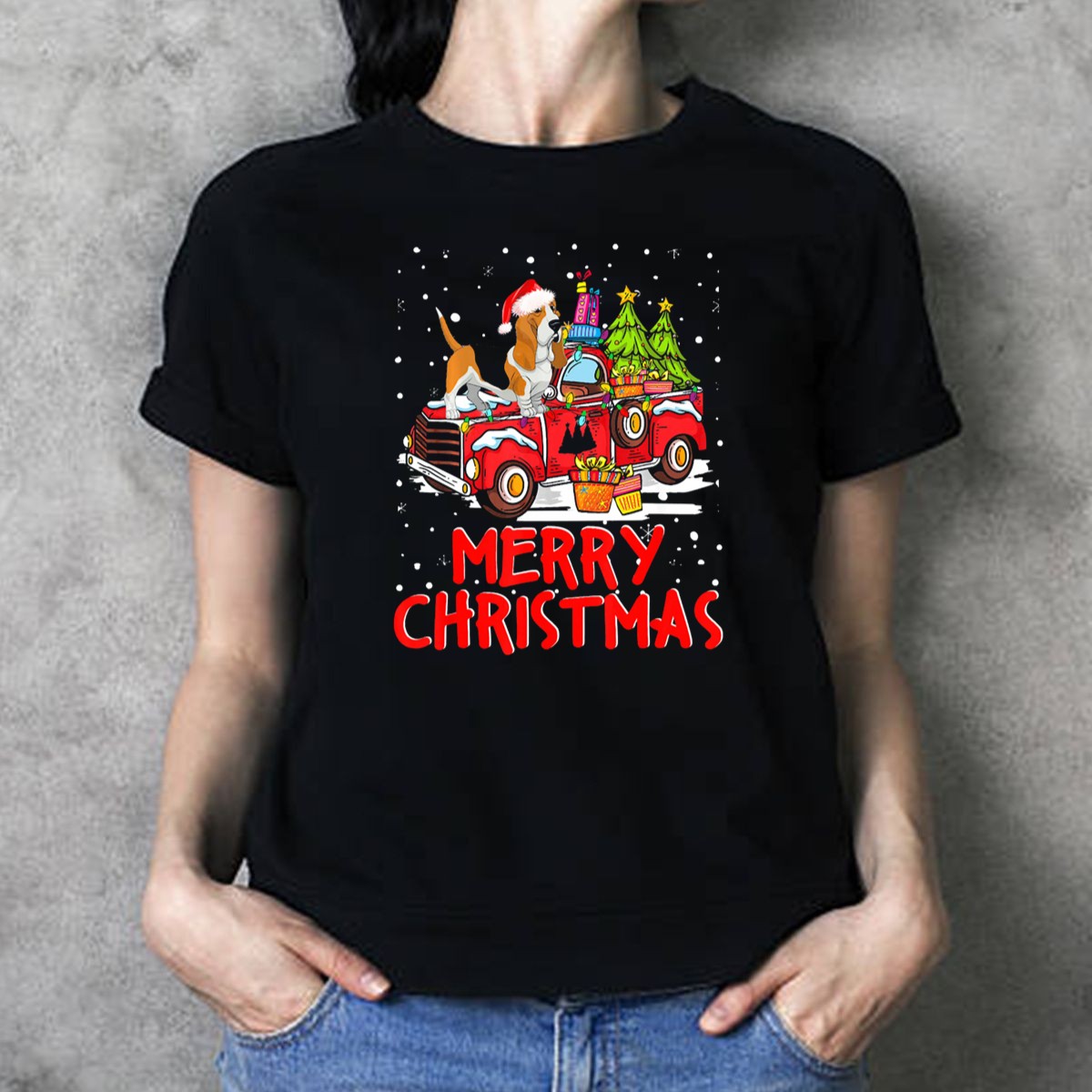 Basset Hound On Red Truck Merry Christmas T Shirt