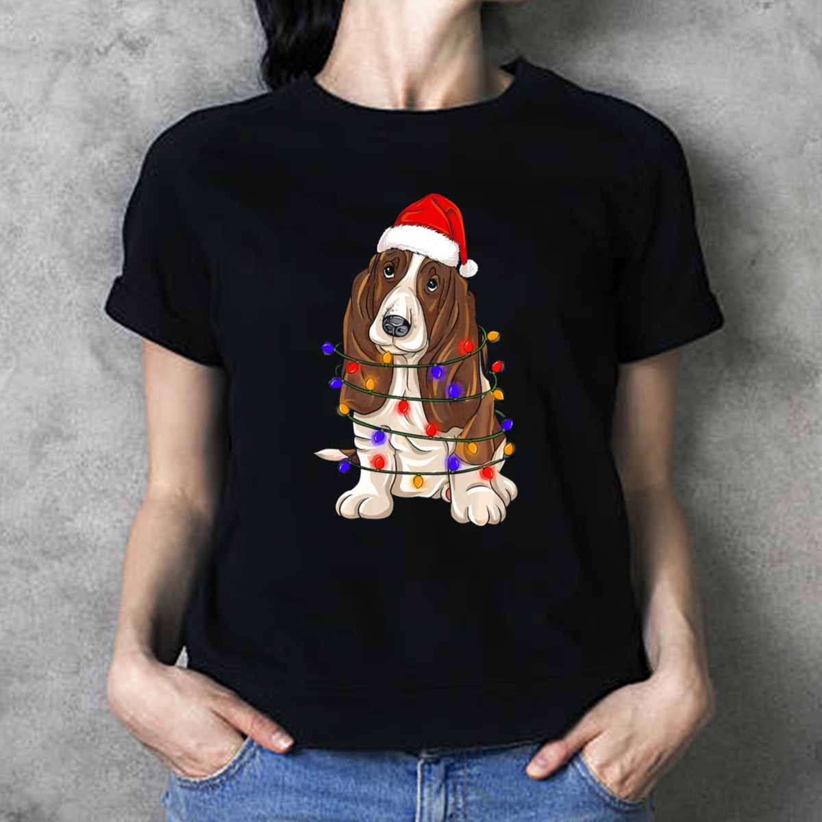 Get into the festive spirit with our Basset Hound Santa Hat Wrapped In Christmas Lights T-Shirt! Perfect for dog lovers and holiday enthusiasts alike, this playful design brings joy and cheer to your casual wear. Whether you’re attending a themed event, gathering with family, or just celebrating the season in style, this shirt ensures you’ll stand out with a unique, fan-made graphic printed right here in the USA.