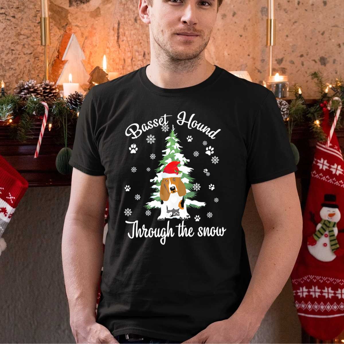 Be the first to review “Basset Hound Through The Snow Santa Hat Christmas Tree Snowflakes Paw Prints T Shirt”
