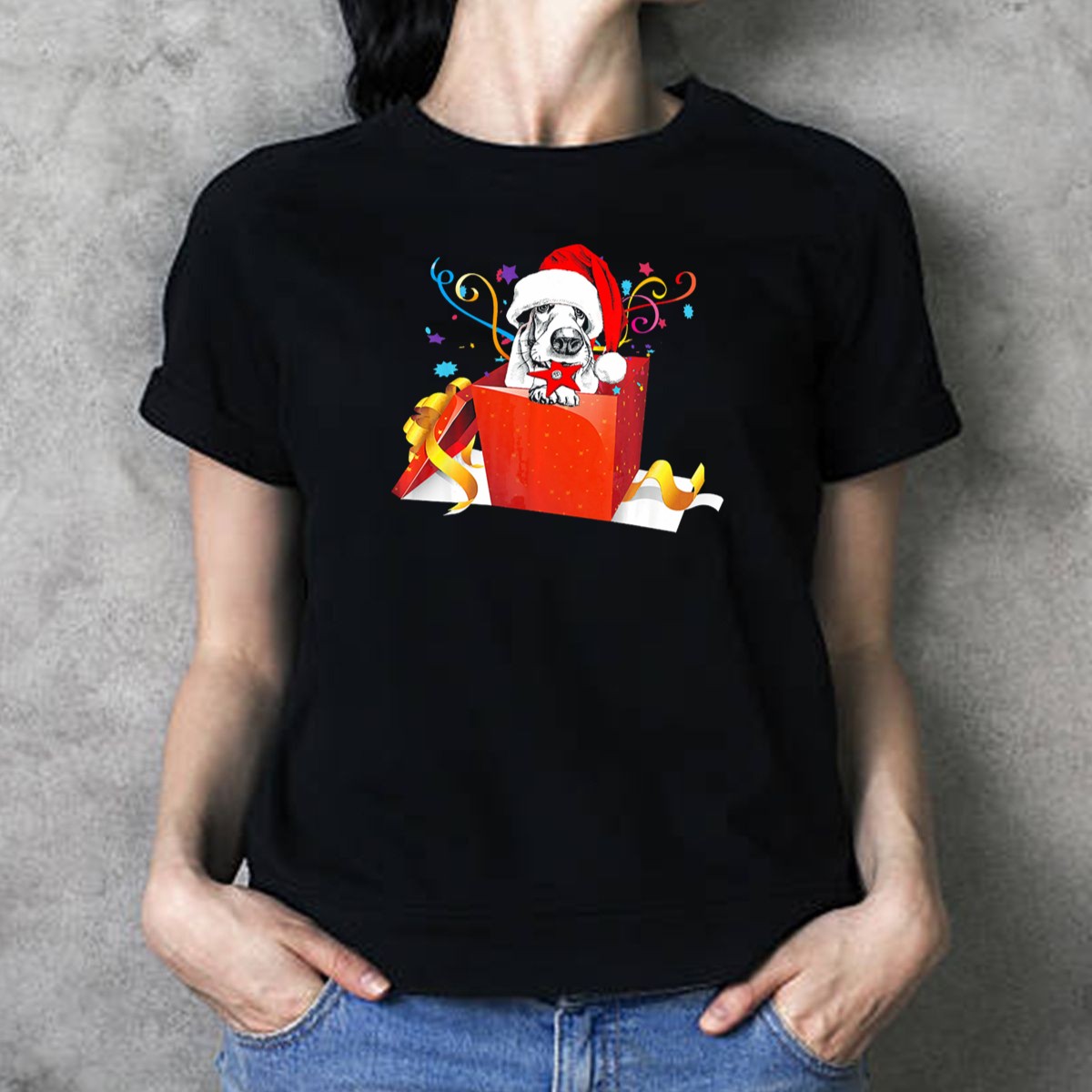 Celebrate the holiday spirit with our adorable Basset Hound With Santa Hat In Festive Christmas Gift Box T-Shirt! Perfect for dog lovers and holiday enthusiasts alike, this shirt is an ideal choice for casual gatherings, themed events, or simply spreading joy during the festive season. The unique fan-made design, printed in the USA, captures the essence of Christmas cheer and showcases your love for Basset Hounds in a fun and stylish way.