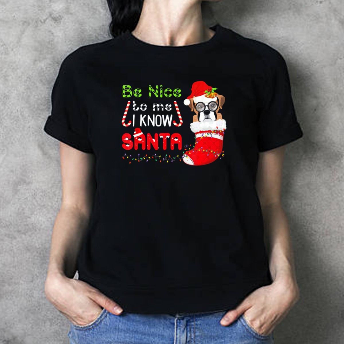 Be Nice To Me I Know Santa Boxer In Christmas Stocking T-Shirt