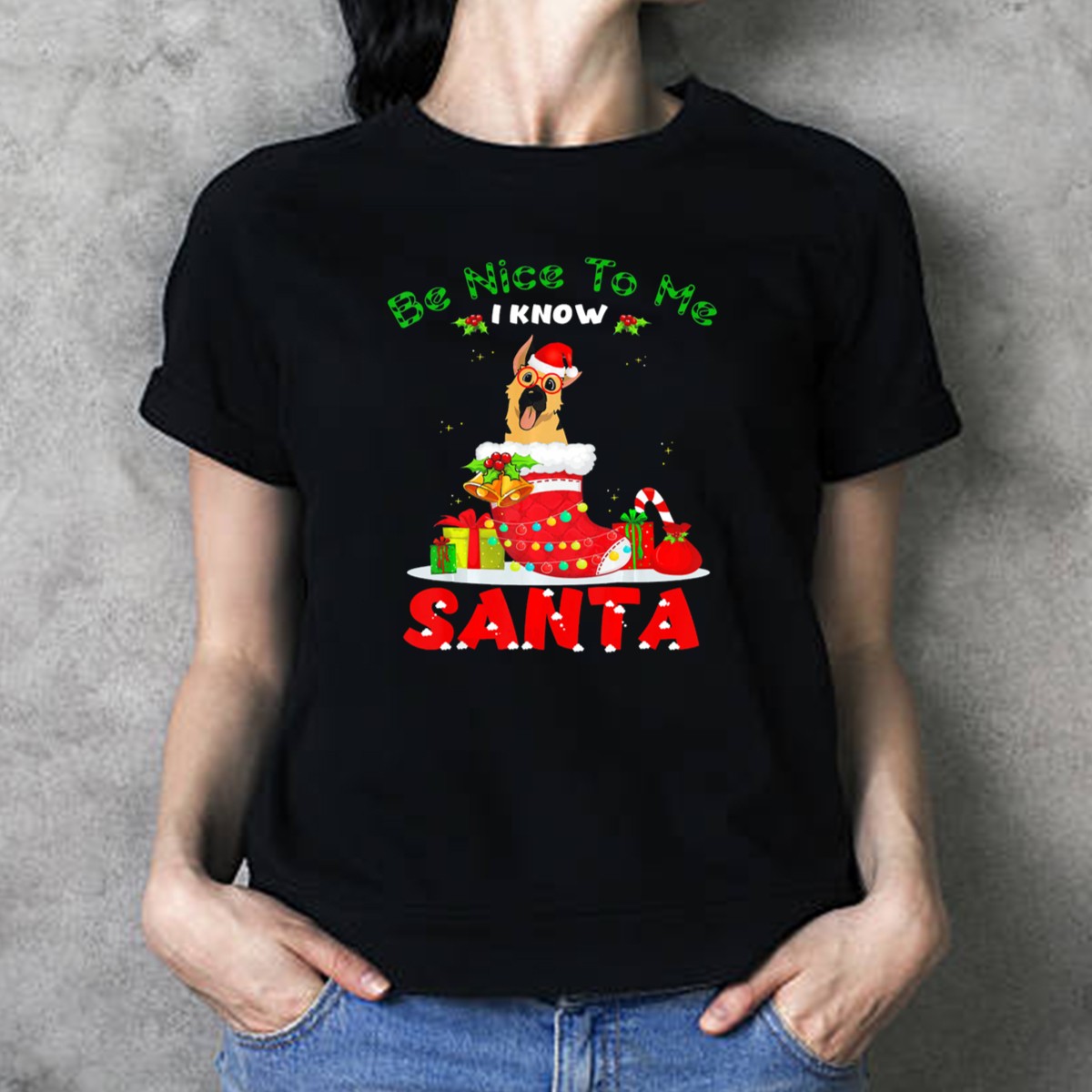 Celebrate the holiday season in style with our “Be Nice To Me I Know Santa” German Shepherd Christmas Stocking T-Shirt! Perfect for dog lovers and holiday enthusiasts alike, this shirt features a fun and festive design that showcases your love for your furry friend. Whether you’re attending a casual gathering, a themed event, or just enjoying daily wear, this shirt is sure to spark joy and conversation. Made for comfort and durability, it’s an ideal choice for all-season wear!