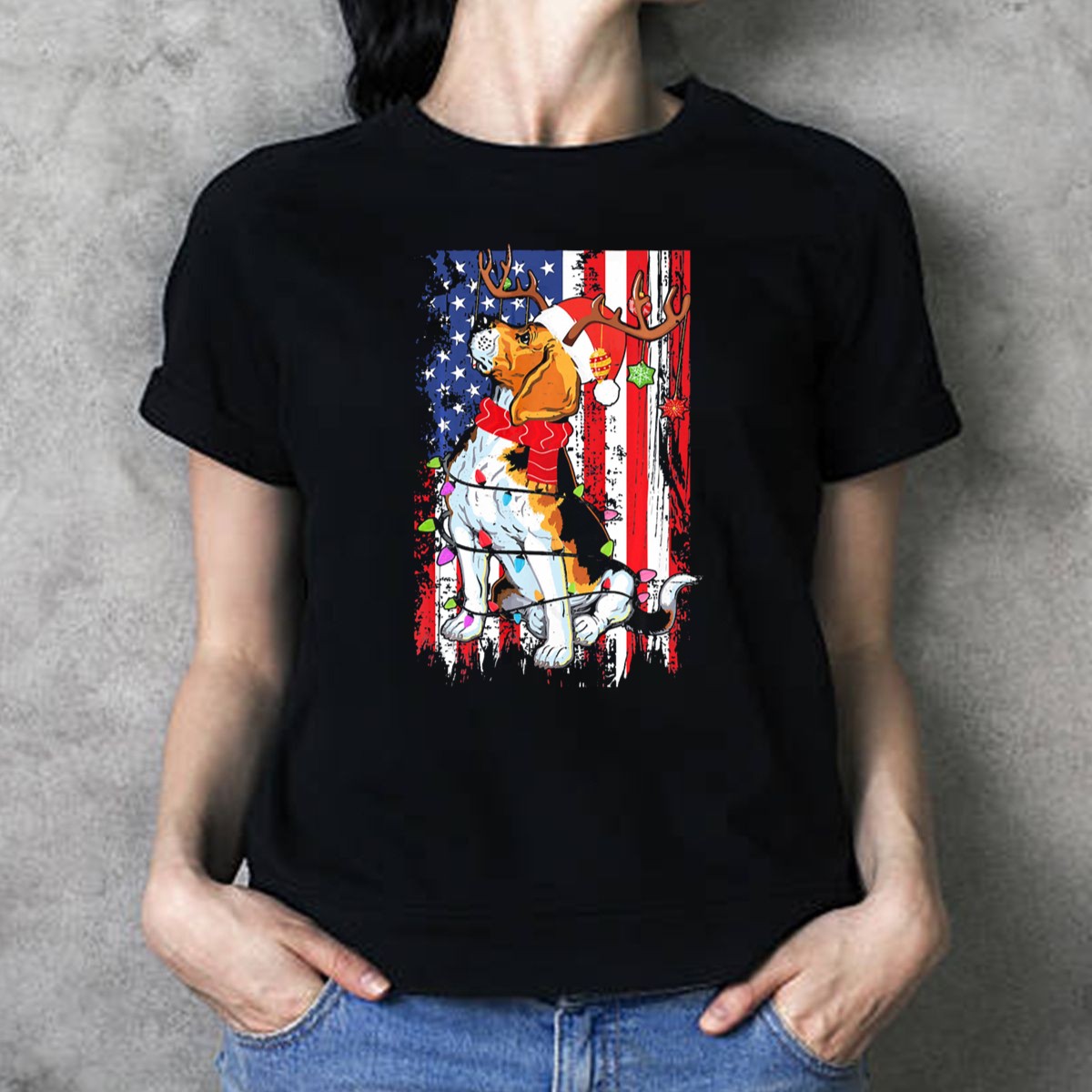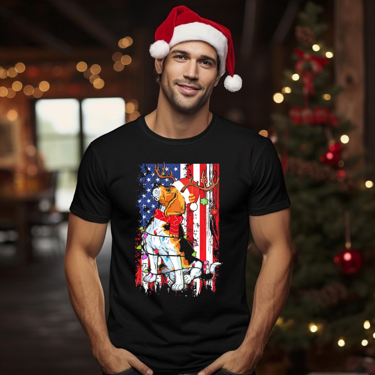 Beagle Christmas Usa Flag With Santa And Reindeer Antlers T Shirt