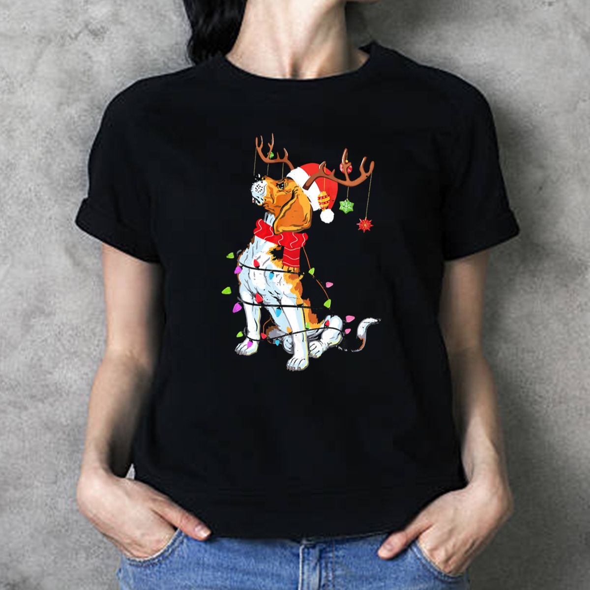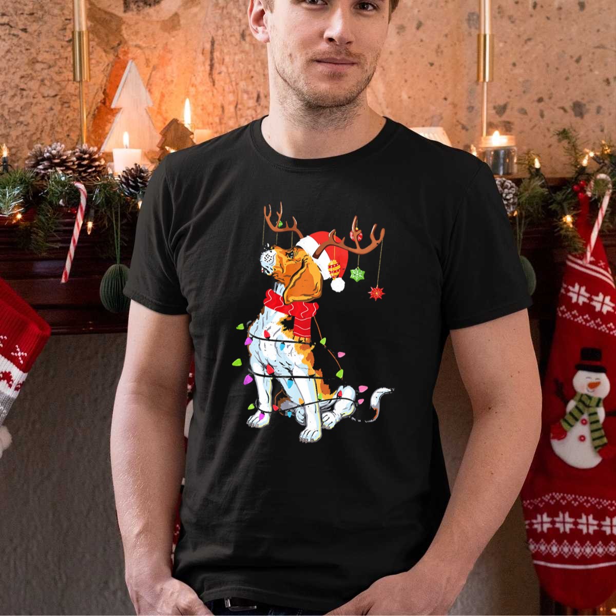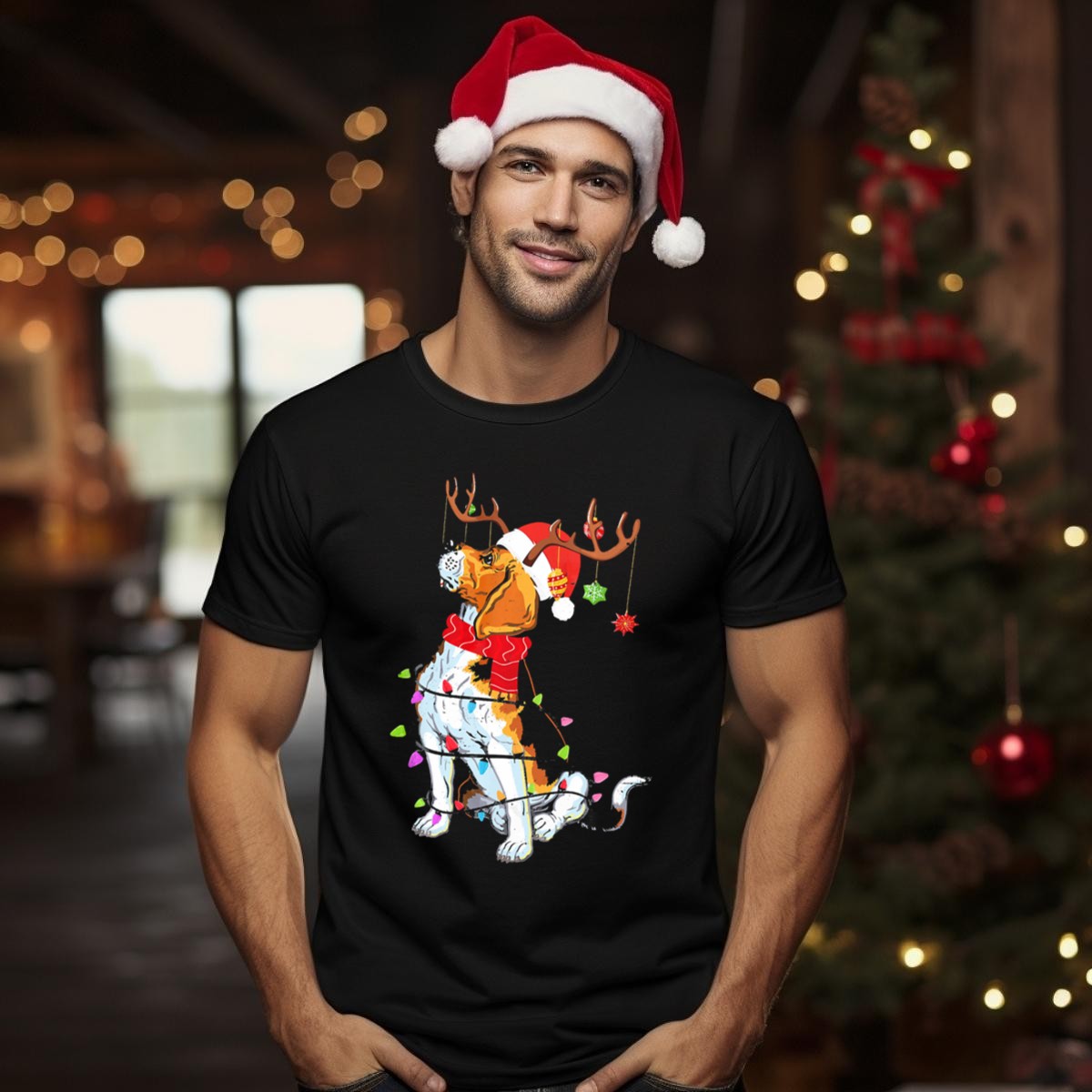Celebrate the holiday spirit with our whimsical Beagle With Reindeer Antlers Wrapped In Christmas Lights And Santa Hat T-Shirt! Perfect for dog lovers and festive fans alike, this fun design adds a playful touch to your casual wear. Whether you’re attending themed events, holiday get-togethers, or simply lounging at home, this shirt is sure to bring smiles and joy to everyone around you. Made with care in the USA, it’s a unique addition to your festive wardrobe!