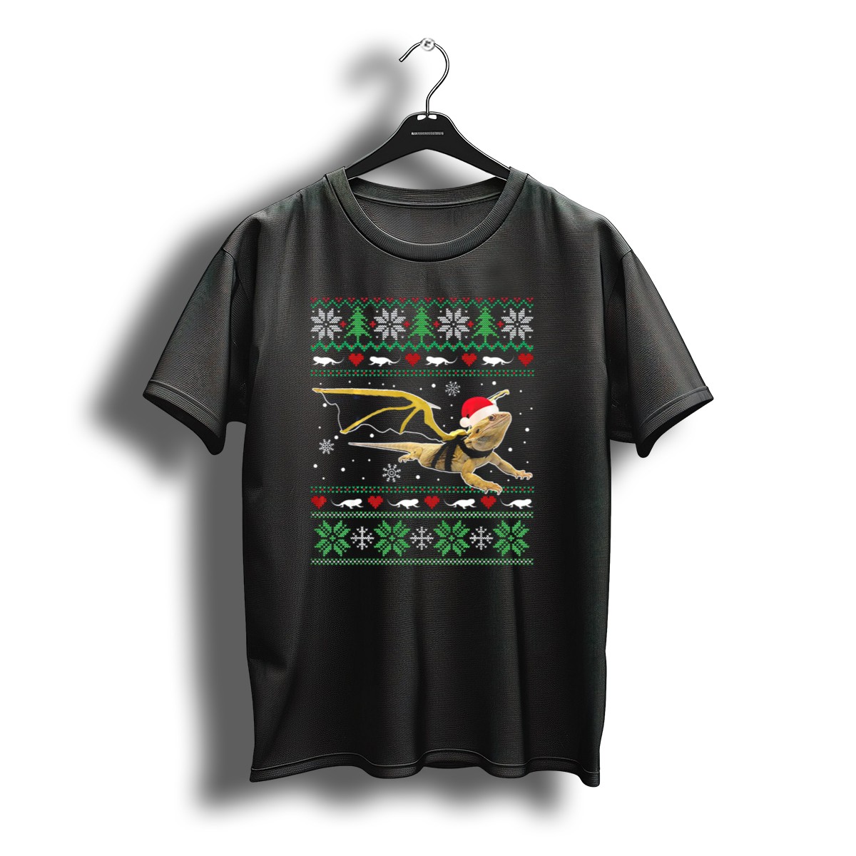 Celebrate the holiday season in style with our Bearded Dragon Santa Hat Ugly Christmas Sweater T-Shirt! This fun and quirky design is perfect for reptile enthusiasts and anyone looking to add a unique twist to their festive wardrobe. Ideal for casual wear, themed events, or daily outings, this shirt is sure to spark conversations and bring smiles wherever you go. Made with care in the USA, it combines comfort and creativity for a truly standout piece.