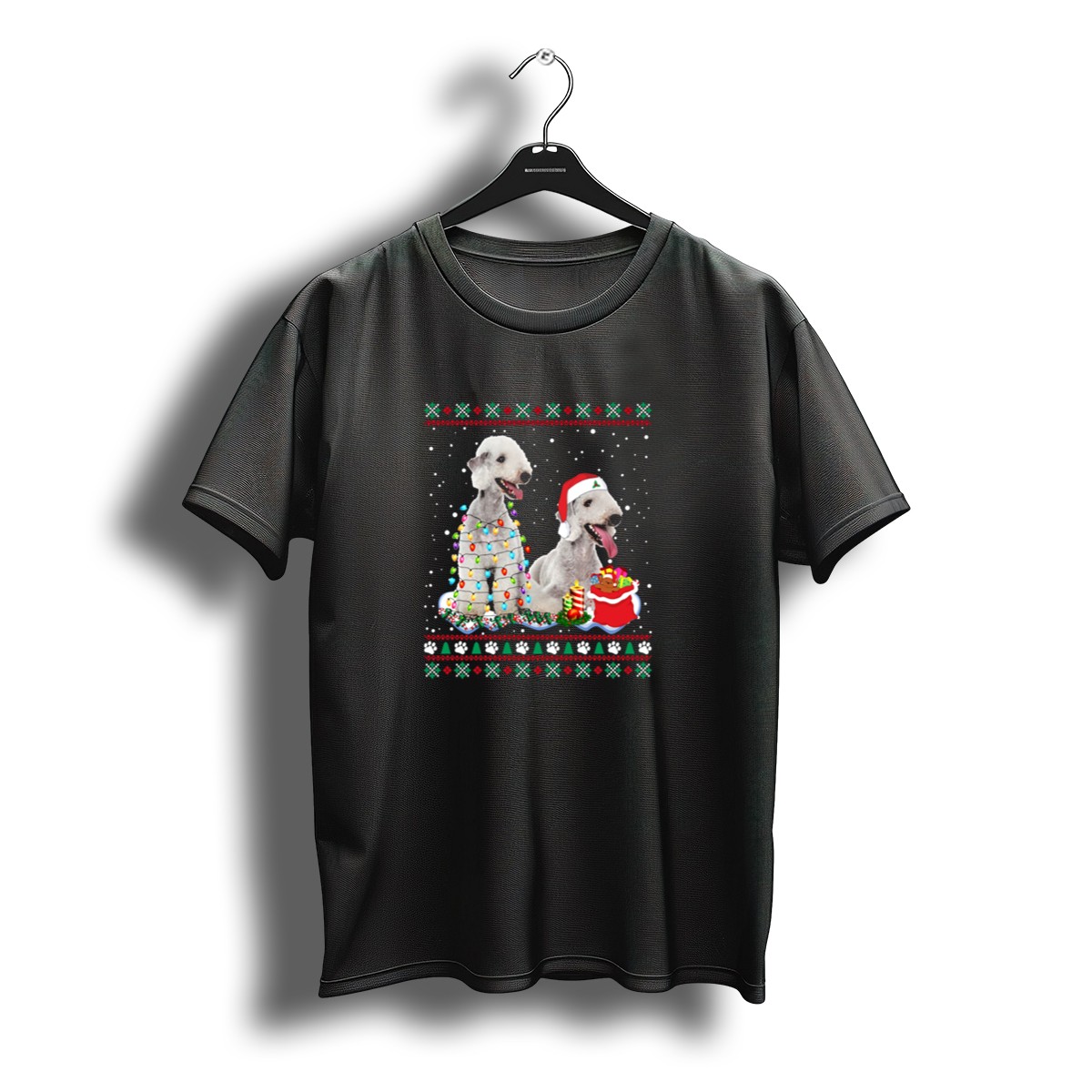 Celebrate the joy of the holiday season with our Bedlington Terrier Christmas Lights and Santa Hat T-Shirt, perfect for dog lovers who want to showcase their festive spirit! This charming design features an adorable Bedlington Terrier adorned with Christmas lights and a Santa hat, set against a delightful snowy backdrop. Ideal for casual wear, themed events, or simply spreading cheer during daily outings, this shirt is a must-have for anyone who wants to combine style with a love for their furry friends. Made in the USA, this fan-made design is sure to bring smiles and warmth wherever you go!