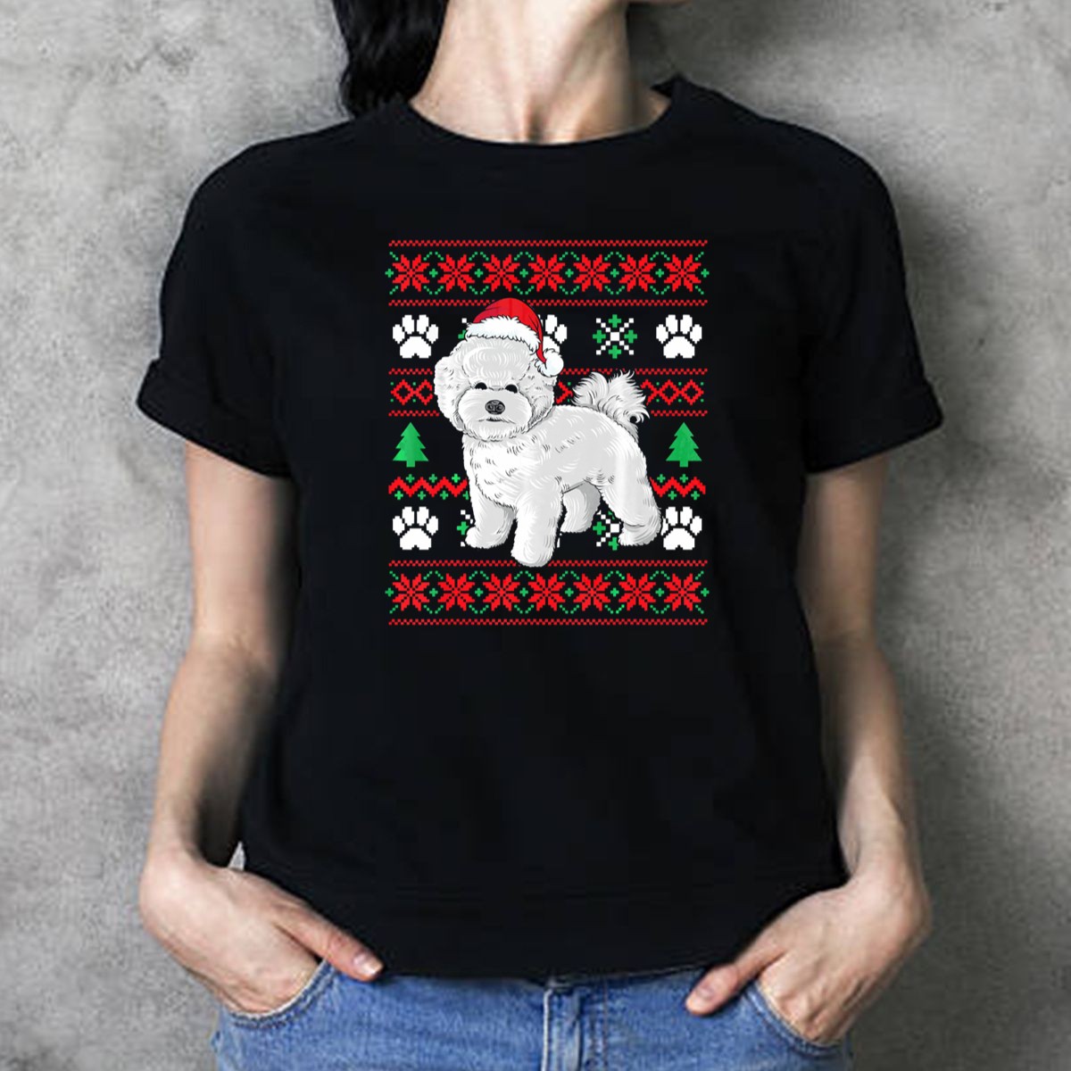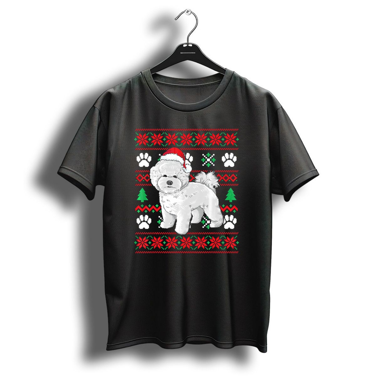 Celebrate the holiday season with our Bichon Frise Ugly Christmas Sweater T-Shirt, perfect for dog lovers and festive enthusiasts alike! Featuring an adorable design of a Bichon Frise wearing a Santa hat surrounded by playful paw prints, this shirt is a must-have for casual wear, themed events, or just spreading holiday cheer. Made in the USA, this fan-made design is sure to turn heads and spark conversations at all your gatherings!