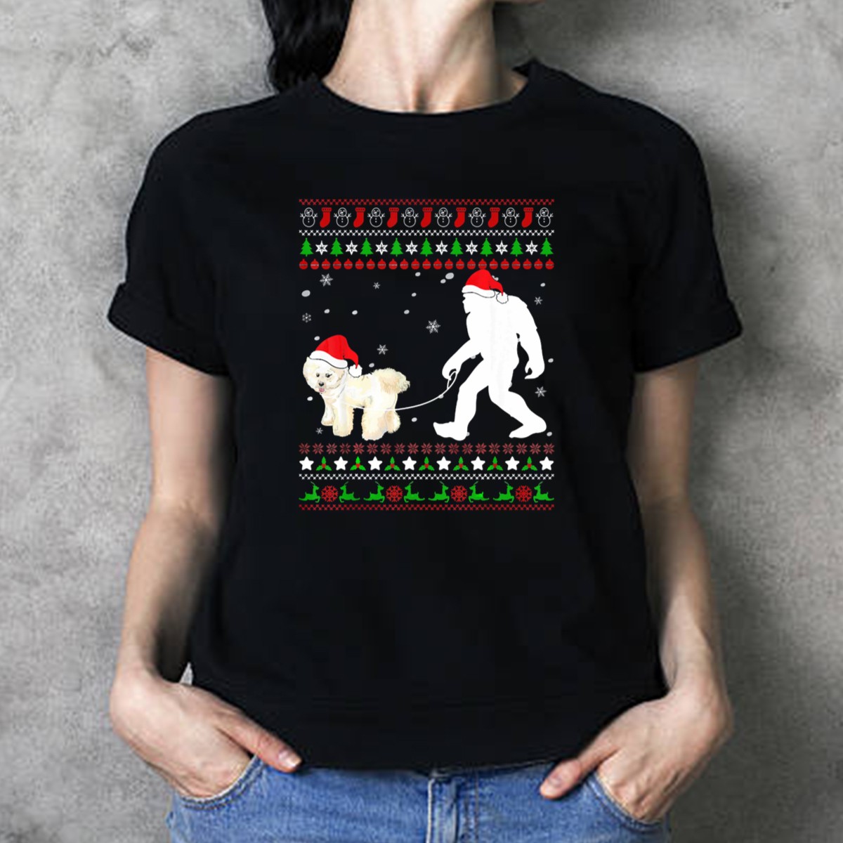 Celebrate the whimsical spirit of the holidays with our Bichon Frise Walk Bigfoot Christmas Santa Hat Snowflakes Ugly T-Shirt! Perfect for dog lovers and Bigfoot enthusiasts alike, this fan-made design brings a playful twist to your festive wardrobe. Ideal for casual wear, themed events, or just spreading holiday cheer, this shirt will keep you comfortable and stylish all season long. Printed right here in the USA, it’s a unique addition to your collection that’s sure to spark conversations.