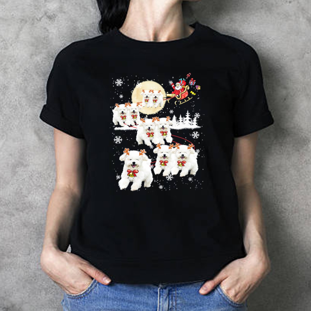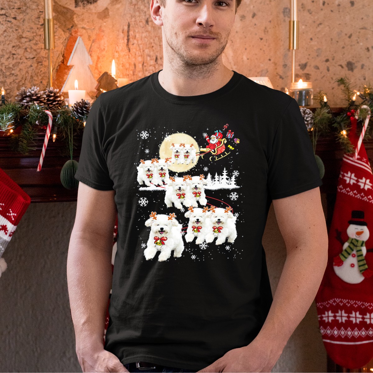 Celebrate the festive season in style with our Bichon Merry Reindeer Santa Sleigh Christmas Snowflakes T-Shirt! Perfect for dog lovers and holiday enthusiasts alike, this shirt features an adorable design that captures the joy of Christmas with a whimsical twist. Ideal for casual outings, themed events, or simply spreading holiday cheer, this fan-made shirt is printed in the USA, ensuring a unique addition to your holiday wardrobe.