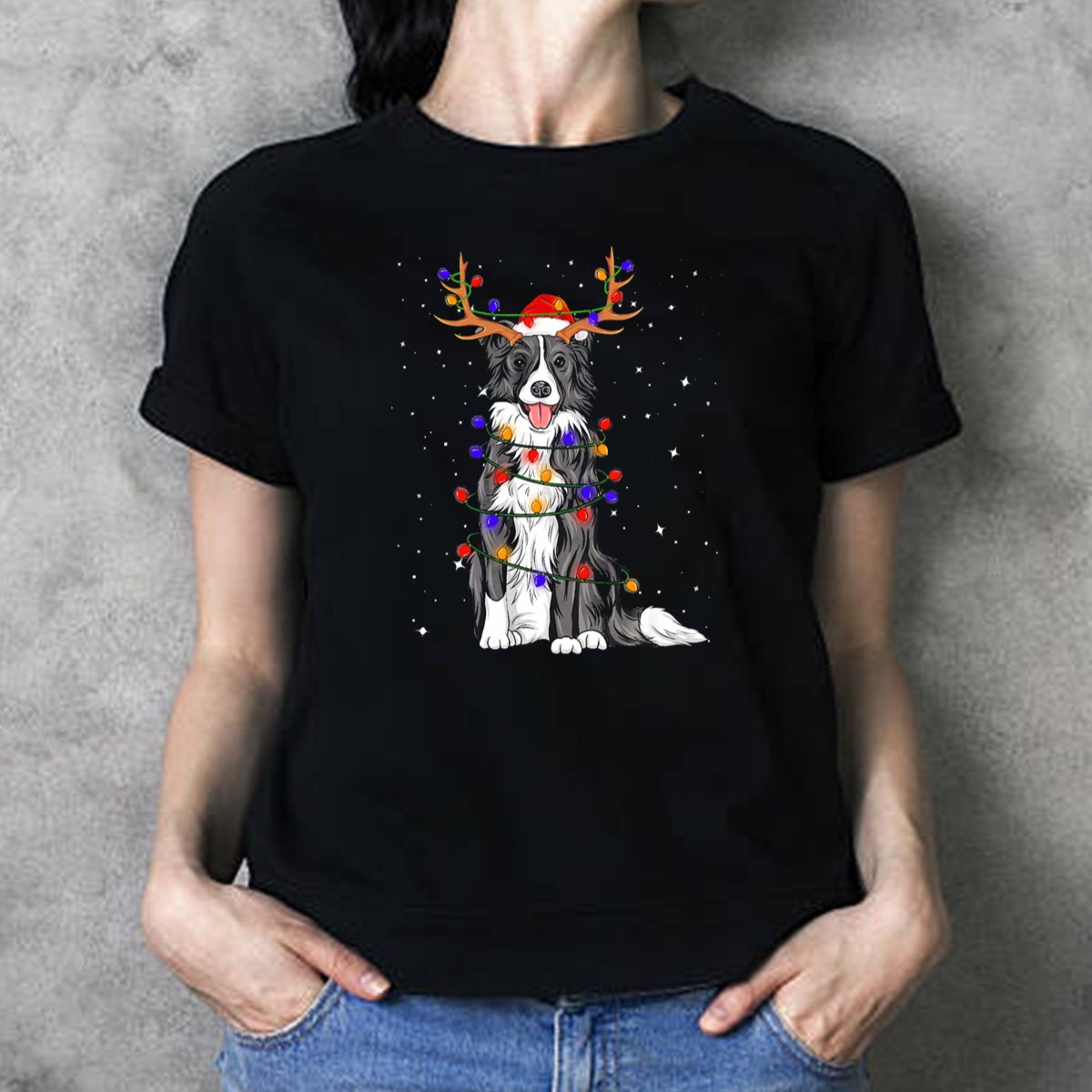 Be the first to review “Border Collie Christmas Lights Reindeer Antlers Santa Hat T Shirt”