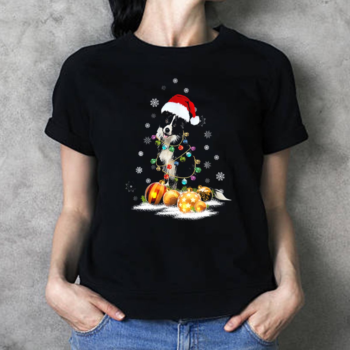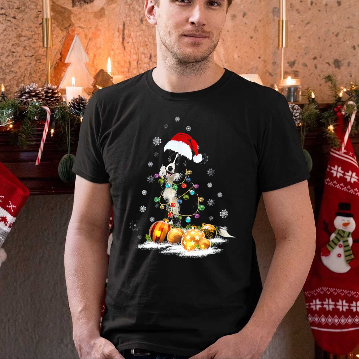 Celebrate the joy of the holiday season with our Border Collie Wrapped In Christmas Lights And Ornaments T-Shirt! Perfect for dog lovers and festive spirits alike, this shirt is designed for casual wear, themed events, or just spreading cheer in your daily adventures. The delightful print features an adorable Border Collie donning a Santa hat, surrounded by twinkling lights and snowflakes, making it a unique addition to your winter wardrobe. Made in the USA, this fan-made design captures the essence of holiday fun while ensuring comfort and style.