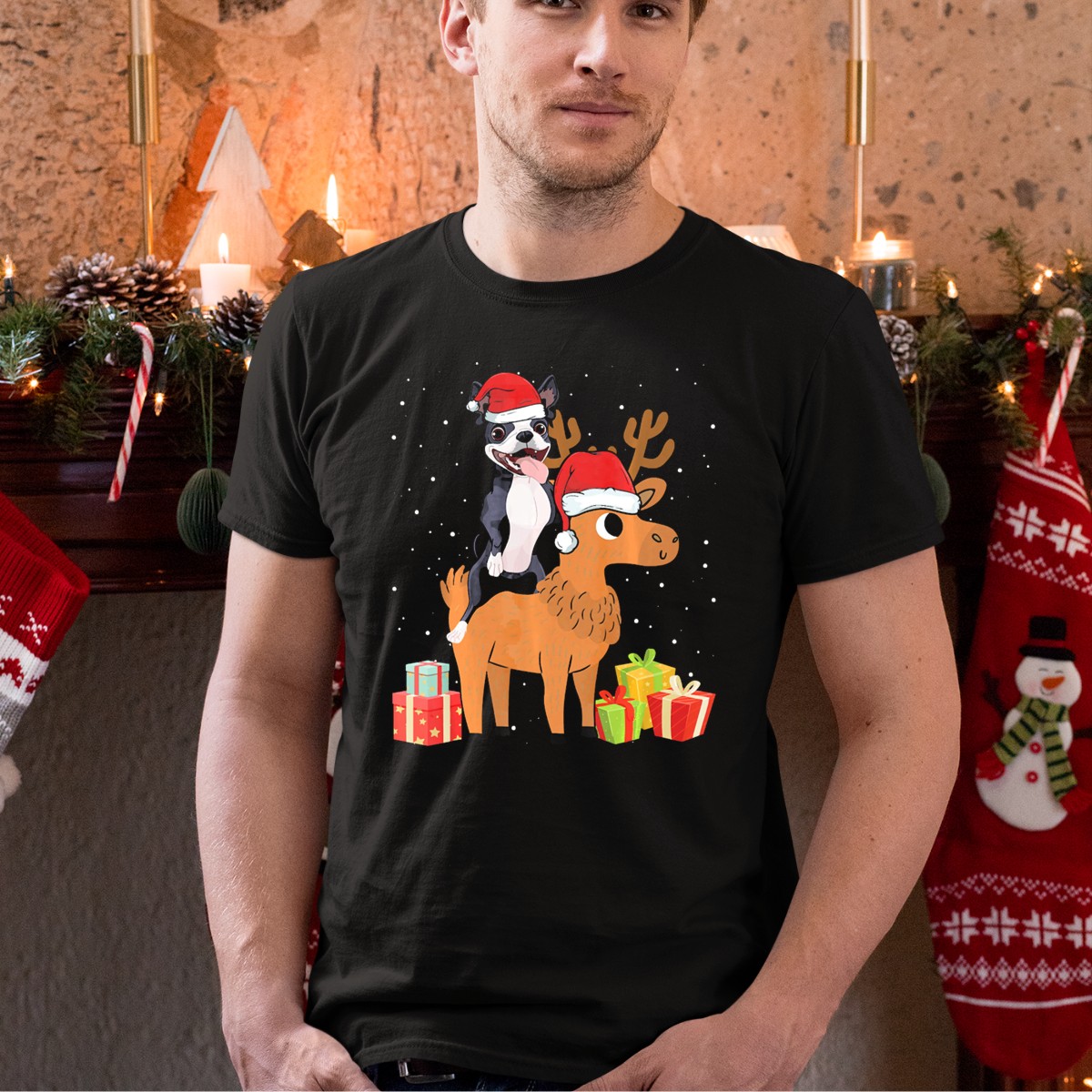 Boston Terrier And Deer Christmas Santa Hats And Gifts T-Shirt