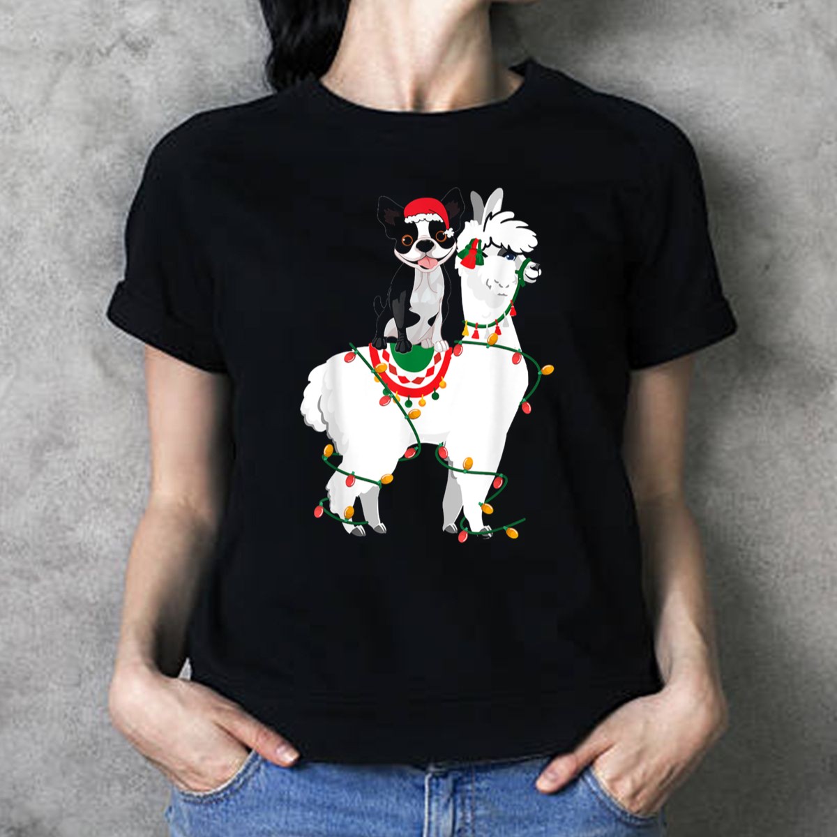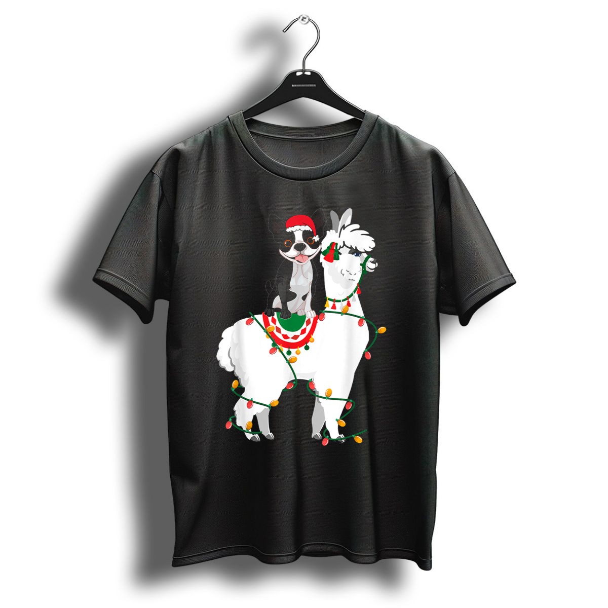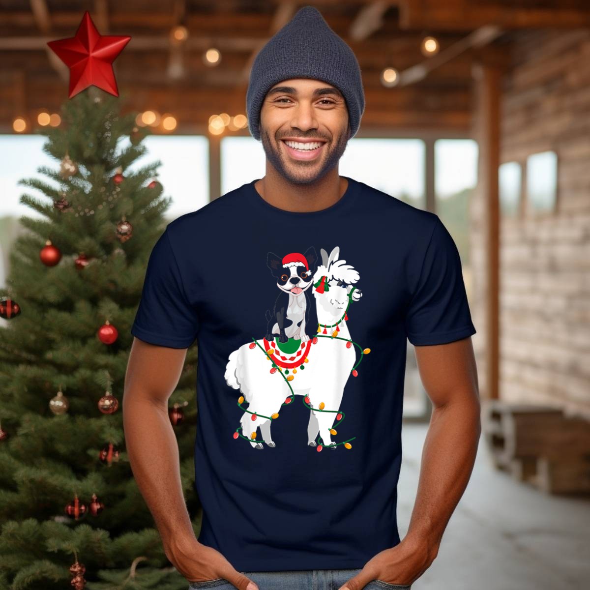 Celebrate the holiday season with our whimsical Boston Terrier in Santa Hat on Llama Wrapped in Christmas Lights T-Shirt! Perfect for dog lovers and llama enthusiasts alike, this fun and festive design is ideal for casual wear, themed events, or just spreading cheer during daily outings. Made for comfort and style, this shirt showcases a unique fan-made design that brings a touch of joy to your wardrobe, all printed in the USA.