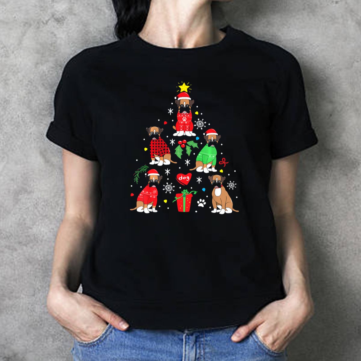Celebrate the festive spirit with our Boxer Dog Christmas Ornament Tree Decor T-Shirt! Perfect for dog lovers and holiday enthusiasts alike, this charming design showcases a delightful boxer dog surrounded by presents and snowflakes, making it an ideal choice for casual gatherings, themed events, or just spreading cheer during the holiday season. Crafted for comfort and style, this shirt is a must-have addition to your winter wardrobe.