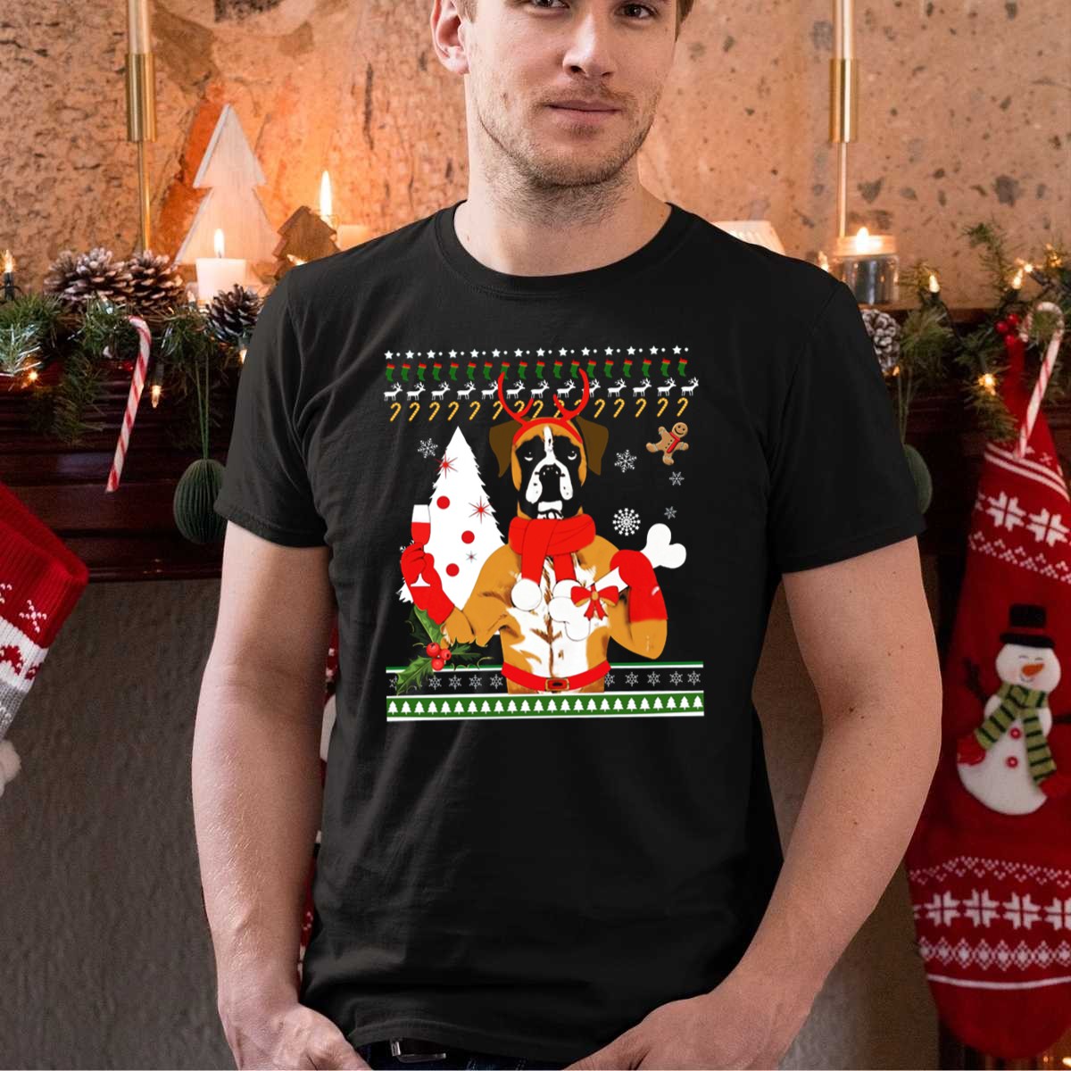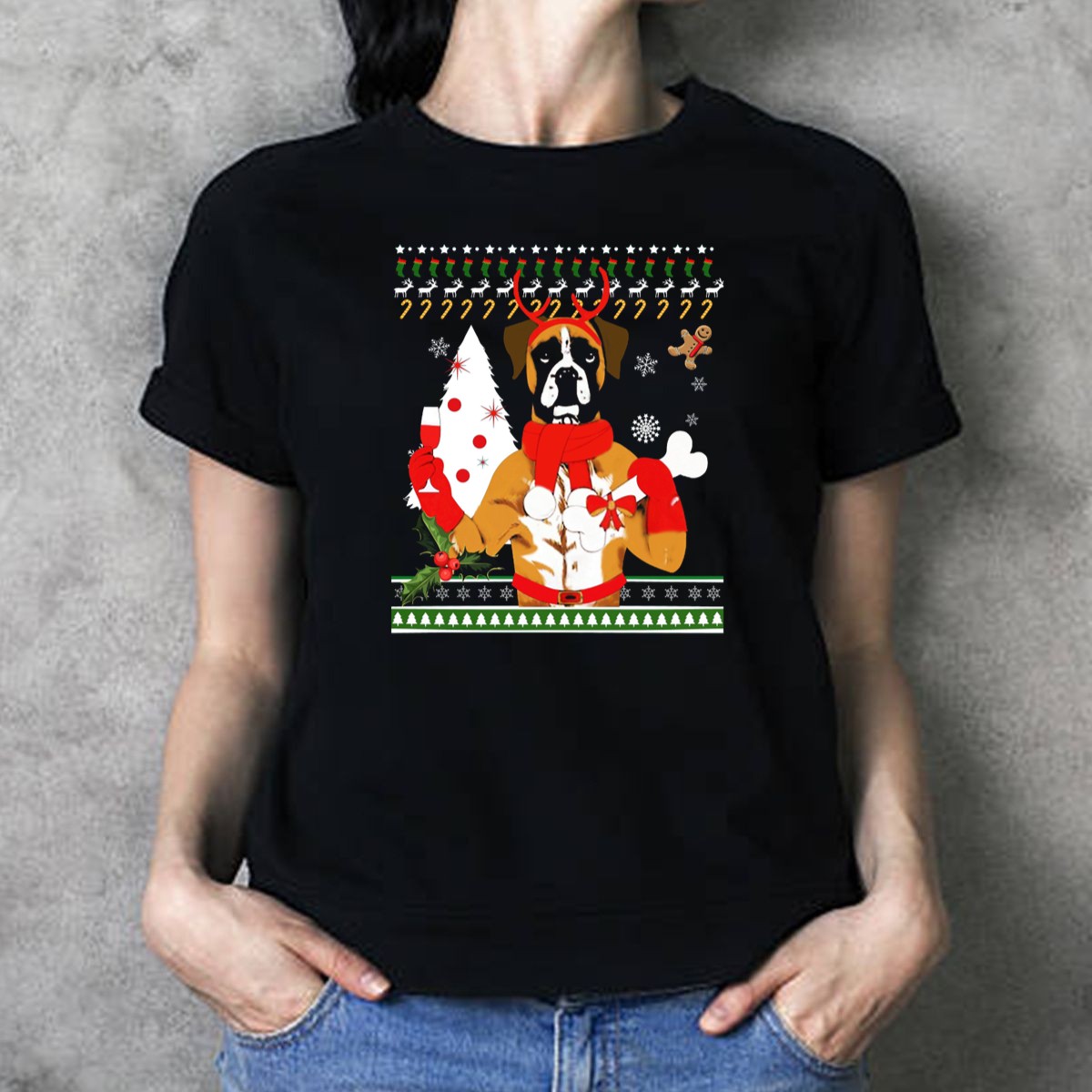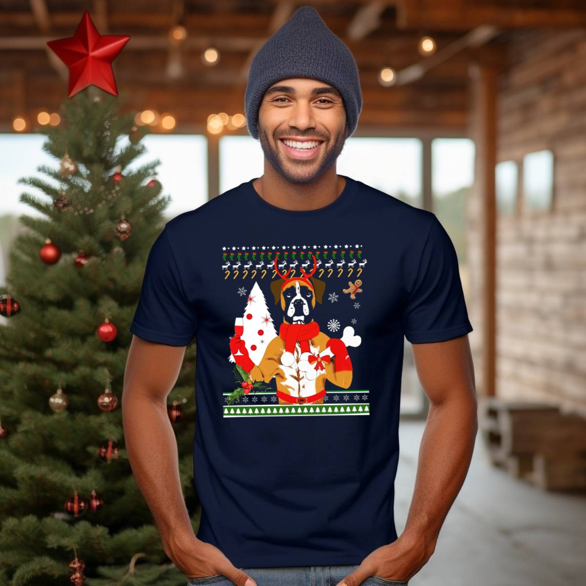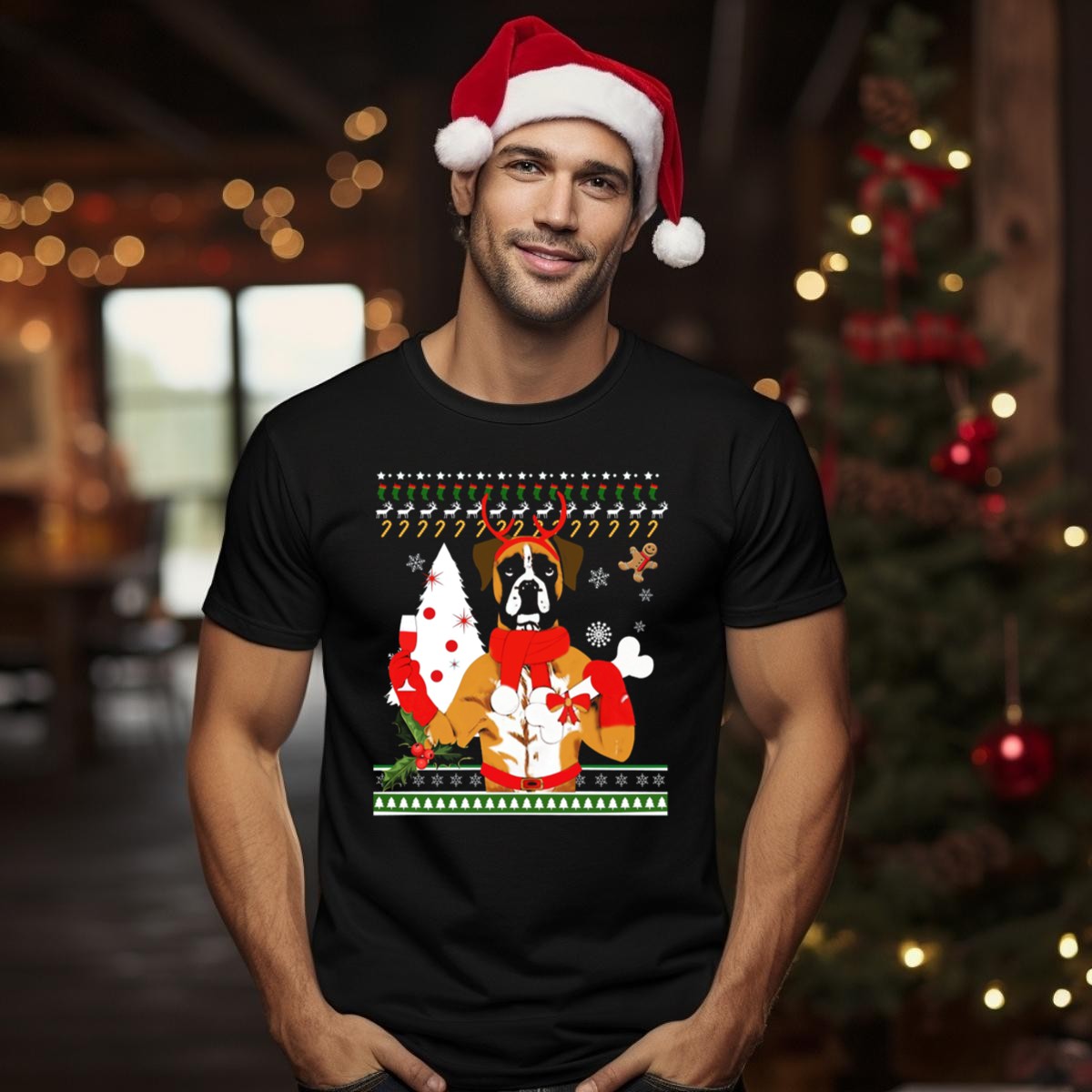 Celebrate the holiday season with our Boxer Dog Christmas Ugly Sweater Style T-Shirt! This fan-made design features an adorable boxer dog sporting reindeer antlers and festive decorations, making it the perfect choice for dog lovers and holiday enthusiasts alike. Ideal for casual wear, themed events, or just lounging around during the festive season, this shirt combines comfort with a playful holiday spirit, ensuring you stand out at any gathering.