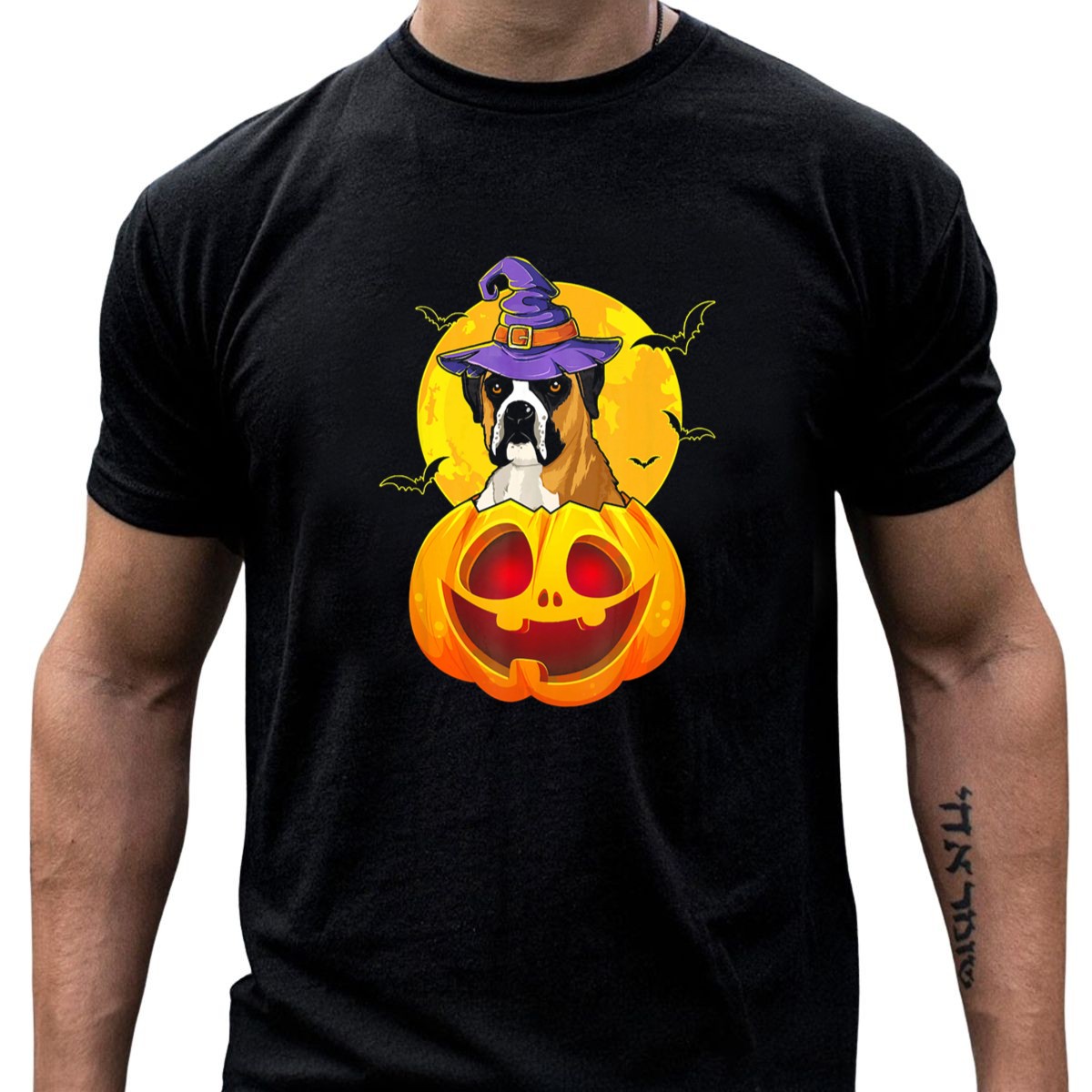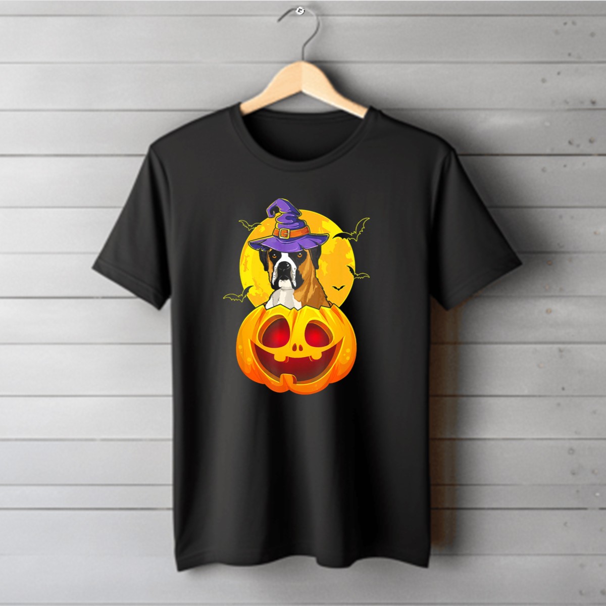 Be the first to review “Boxer Dog Witch Hat Halloween Jack O Lantern Full Moon Bats T-Shirt”
