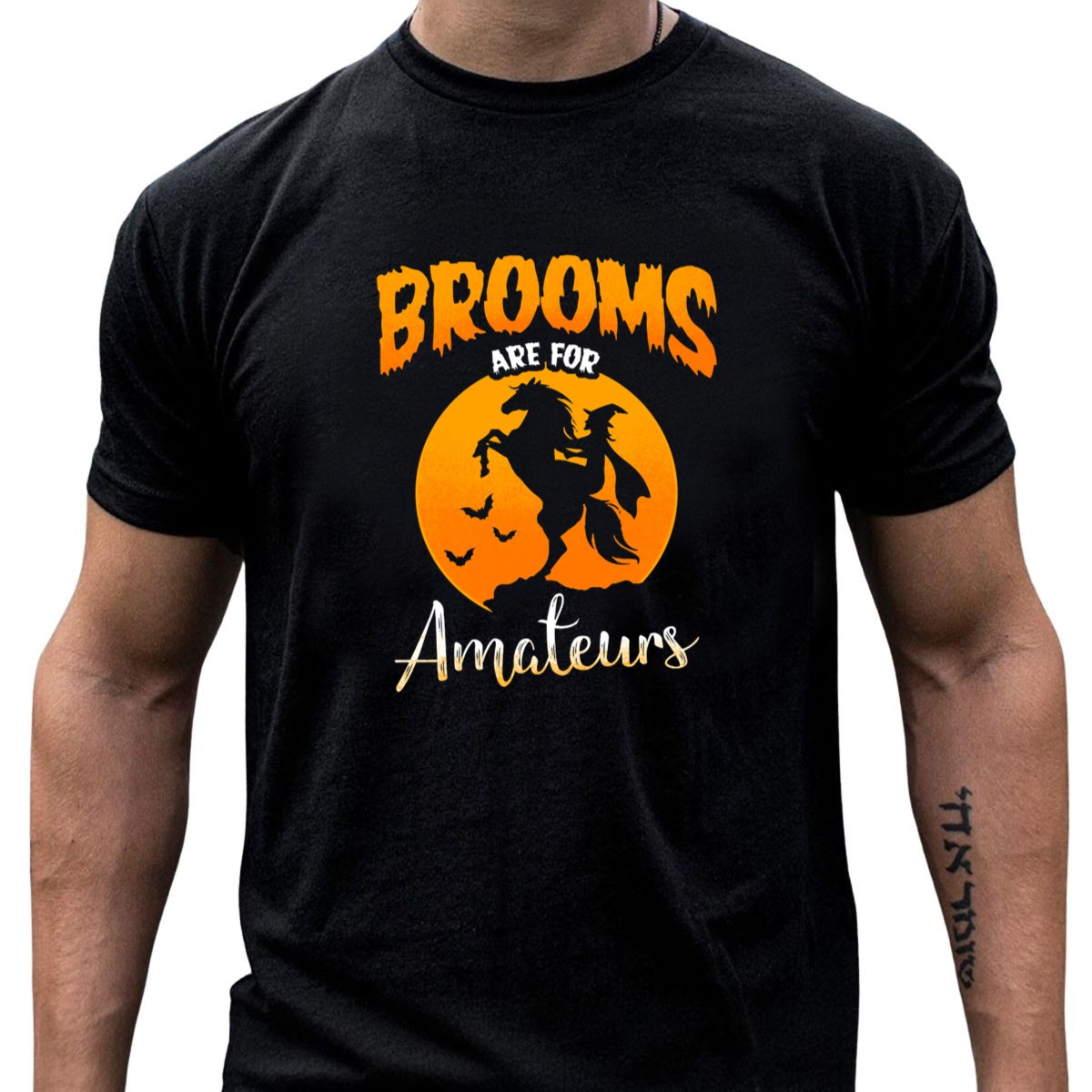 Embrace your inner witch this Halloween with our “Brooms Are For Amateurs” graphic T-shirt! Perfect for those who love to celebrate the spooky season in style, this shirt features a playful design of a witch riding a horse surrounded by bats. Whether you’re heading to a themed event, a casual gathering, or just enjoying daily wear, this fan-made design captures the spirit of Halloween in a fun and unique way. Crafted for comfort and breathability, it’s an ideal choice for all-season wear!